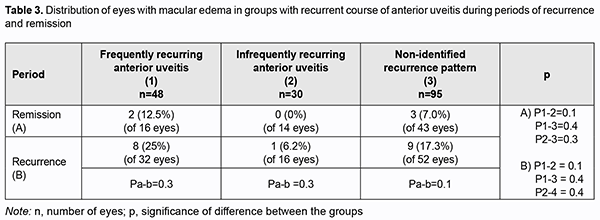 There was no significant difference in the rate of ME among groups with recurrent uveitis (Table 3) both during recurrence and during remission. In addition, there was no significant difference in the rate of ME between patients with primary uveitis and those with recurrent disease.
