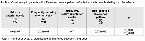 Among eyes with ME, mean visual acuity was 0.28 ± 0.07 for those with frequent recurrences of anterior uveitis, and 0.37±0.09 for those with non-identified recurrence pattern of uveitis. Compared to eyes with aggravated ME, those with primary disease process or with infrequent recurrences of anterior uveitis showed better visual acuity (0.6-0.7; p < 0.05), likely because damage to the blood retinal barrier and sensory retina was not yet severe (Table 4).