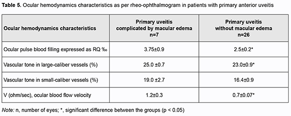Pulse blood filling of the ICS in patients with primary uveitis was 11% lower than in normal individuals (p < 0.05). In patients with primary uveitis complicated by ME, pulse blood filling of the ICS was 40% higher than in normal individuals (p < 0.05) and 56% higher than in patients with uncomplicated primary uveitis (p < 0.05) ( Table 7).