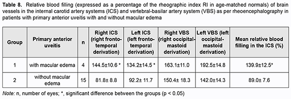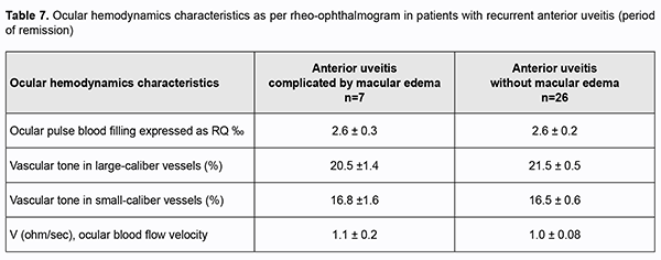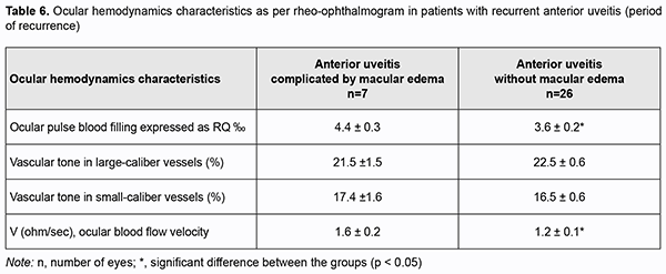 Keywords: anterior uveitis, complications, macular edema, ocular and brain hemodynamics, ophthalmic rheography, rheoencephalography