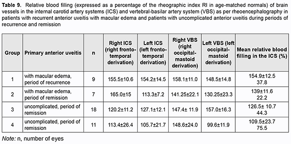 Pulse blood filling of the anterior brain regions in patients with recurrent anterior uveitis complicated by ME was 54% higher (p < 0.05), whereas that in patients with remission of recurrent anterior uveitis complicated by ME, 39% higher (p < 0.05) than in normal individuals. There was no significant difference in pulse blood filling of the anterior brain regions between patients with recurrent anterior uveitis complicated by ME and patients with remission of recurrent anterior uveitis complicated by ME. Compared to normal individuals, relative pulse blood filling of the ICS in patients with primary uveitis complicated by ME was 47% higher, whereas that in patients with uncomplicated primary uveitis, 17.5% higher. Relative pulse blood filling of the ICS in patients with recurring anterior uveitis complicated by ME was 30% higher than in patients with uncomplicated recurring anterior uveitis (p = 0.03; Table 9).Therefore, the results of these studies allowed us to identify the features of reactivity of the vascular systems of the brain and the eye in anterior uveitis.