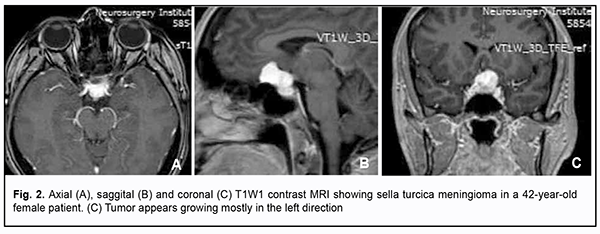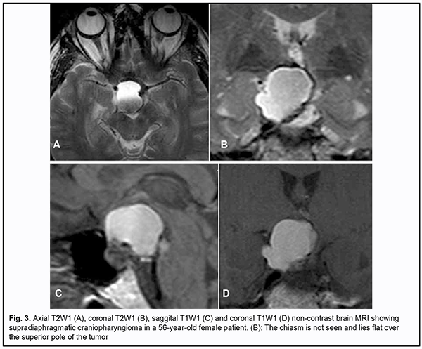 Loss of visual acuity and/or visual fields was found in 500 (100%) patients. Pituitary adenoma (PA) was the most common tumor-causing loss of visual acuity or visual fields (420 patients; 84%; Fig. 1), followed by sella turcica meningioma (35 patients; 7%; Fig. 2), craniopharyngioma (33 patients; 6%; Fig. 3), chiasmal glioma (8 patients; 2%), germinoma and teratoma (4 patients; 1%). There was surgical evidence both of suprasellar extension of the SBT and of compression of the optic nerve/chiasm complex in all patients.