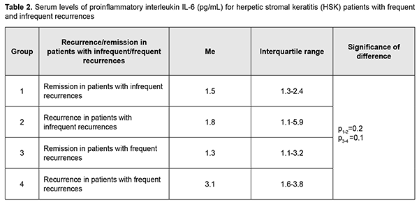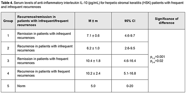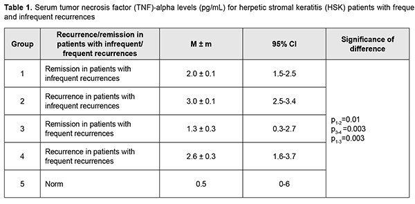 Levels of pro-inflammatory (TNF-α and IL -6) and anti-inflammatory (IL -10 and IL- 4) interleukins in ocular herpes patients with frequent and infrequent recurrences N. I. Khramenko, T. B. Gaidamaka, G. I. Drozhzhyna, L. N. Velychko SI "The Filatov Institute of Eye Diseases and Tissue Therapy of the NAMS of Ukraine; Odesa (Ukraine) E-mail: khramenkon@gmail.com TO CITE THIS ARTICLE:Khramenko NI, Gaidamaka TB, Drozhzhyna GI, Velychko LN. Levels of pro-inflammatory (TNF-α and IL -6) and anti-inflammatory (IL -10 and IL- 4) interleukins in ocular herpes patients with frequent and infrequent recurrences. J.ophthalmol.(Ukraine).2020;5:13-20. http://doi.org/10.31288/oftalmolzh202051320 Background: Herpes simplex virus ocular infection is the major cause of corneal blindness in developed countries. The methods used for the treatment of recurrent herpes infections give only temporary remission, and the results of studies on prevention and prediction of the course of the disease are contradictory, which makes management of these infections not only medically, but also socially important. The mechanism of recurrence of herpetic stromal keratitis (HSK) infection has not been clearly understood, since the disease involves complex pathophysiological mechanisms and immune factors (including cytokines) are complexly interrelated in the pathogenesis. Purpose: To assess serum levels of proinflammatory cytokines (TNF-α and IL-6) and anti-inflammatory cytokines (IL-10 and IL-4) in ocular HSK patients with frequent and infrequent recurrences during remission and recurrence. Material and Methods: Thirty-three in-patients (15 patients and 18 patients experiencing less than and more than one recurrence annually, respectively) treated for recurrent HSK at the Department of Corneal Disorders of the Filatov Institute were included in the study. Serum IL-4, IL-6, IL-10 and TNF-α levels were determined using enzyme-linked immunosorbent assay (ELISA) kits from Vektor-Best (Novosibirsk, Russia) according to the manufacturer’s instruction. Photometric measurements were performed on an ELISA plate reader (Stat Fax 2100, Awareness Technologies Inc, Palm City, FL). Reference normal values were taken from the manufacturer’s instructions. Results: We found that the mean serum TNF-α level in patients with infrequent recurrences and in those with frequent recurrences during remission was 2.6 times and 4 times, respectively, higher, and during recurrence, 5.6 times higher, compared to normal values, which is likely to indicate a subclinical inflammatory process. Both in patients with infrequent recurrences and in those with frequent recurrences of keratitis, the mean serum TNF-α level was 50% higher during recurrence than during remission. The mean serum IL-6 level during remission was comparable to, and during recurrence was 3 times higher than the norm, with no significant difference between patients with infrequent and frequent recurrences. Serum IL-4 levels in patients with infrequent and frequent recurrences were 8.5 times and 22.5 times, respectively, higher than reference values. During recurrence, the mean serum IL-4 level in patients with frequent recurrences was 39% higher than in those with infrequent recurrences. No significant difference was observed in serum IL-10 level between remission and recurrence for patients with infrequent recurrences, with a mean value being 24% higher than reference values. The mean serum IL-10 level (for recurrence and remission) in patients with frequent recurrences was 74% higher than for patients with infrequent recurrences (p = 0.01), and two times higher than reference values. Conclusion: HSK in patients with frequent recurrences was characterized by the pattern of regulation of cytokine expression, with decreased expression of TNF-α and increased expression of pro-inflammatory (IL-6) and anti-inflammatory (IL-10 and IL-4) interleukins, which might reflect a mechanism of autoimmune response in such a course of herpetic keratitis. Keywords: herpetic stromal keratitis, cytokines, TNF-α, IL-10, IL-10, IL-4