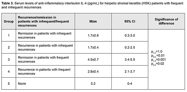 The mean serum IL-4 level in patients with infrequent recurrences during was 1.7 ± 0.4 pg/mL, and was practically similar for recurrence and remission (Table 3).