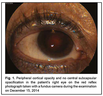Introduction Findings of the post-Chornobyl eye examination studies in numerous cohorts of individuals exposed to radiation have changed our understanding of the effects of ionizing radiation on the eye. The new findings allowed us to change our view of radiation cataract, the most well known eye disease directly caused by radiation [1]. Since the disease has specific clinical features which are unique, post-Chornobyl cases of radiation cataract were easily distinguished and studied in detail [2-4]. The findings from the relevant studies have significantly changed our view of the ionizing radiation dose required to produce a radiation cataract [1, 3, 4]. Studies are underway on radiation cataractogenesis [5] and management of various retinal disorders [6, 7] that have been recently associated with ionizing radiation exposure [8-10]. The new data on the latent period, the time between radiation exposure and the appearance of lens opacities, is of importance. There is a lack of generalized data of the duration of the latent period, since in the past, most authors reported only on isolated cases of radiation cataract. Nevertheless, it has been generally recognized that radiation cataract may develop as early as a few years after radiation exposure [2]. We have demonstrated previously that, the mode value for the latent period for the identified post-Chornobyl cases of radiation cataract was 9 years [1, 3]. Case reports on late-onset radiation cataracts are important both from theoretical and practical points of view, because studying such cases is important for developing strategies for conservative and surgical management of survivors of radiation accidents and attacks, and helps to consider hypotheses on the pathogenesis of radiation cataract. Material and Methods A female patient born in 1937 is under our regular supervision. In early May of 1986, she was on a business trip to Chornobyl, visited the industrial site of the Chornobyl nuclear power plant (CNPP), and within a short period was at the direct line of sight from CNPP Unit 4. Although there is no direct individual dose measurement data available on the patient, bat reconstruction of individual doses by analytical and calculation methods may be performed, and we hope to report on the results in the future. After completing her business trip to Chornobyl in May 1986, the patient lived outside the areas of substantial radiation pollution [11-14], did not undergo radiological procedures, and was not involved in elimination of the consequences of any other radiation accident. Because over years, the patient had had the annual routine eye examination (visual acuity assessment and tonometry; in addition, biomicroscopy, lens examination and red reflex photography (using a fundus camera), ophthalmoscopy, and fundus photography (using a fundus camera) performed under dilated pupil conditions), the time of onset of specific lens opacity could be placed within a period of several months. Results Below are presented the results of eye examinations performed prior to and after finding signs of radiation cataract. On examination performed on December 15, 2014, no signs of radiation cataract were detected, but the lens showed mild peripheral cortical opacity (Fig. 1), and there was mild dry age-related macular degeneration (AMD). The fasting blood glucose level was 5.2 mmol/L.