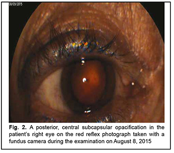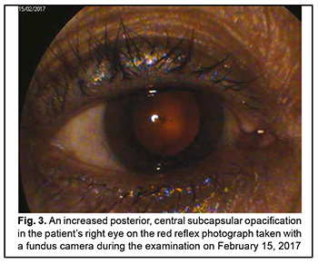 Thereafter, a rather fast progression of opacity was observed. Immediately after examination performed on February 15, 2017 (Fig. 3), because of progression of central subcapsular opacity in the right eye, the patient was recommended to have surgery.