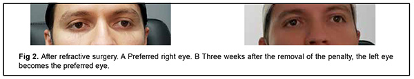 Introduction Amblyopia consists of a decrease in visual acuity in one or both eyes and occurs in the child's visual development period from birth to approximately 8 years of age. This decrease in visual acuity may be accompanied by other visual disturbances such as decreased contrast sensitivity, spatial distortion, and decreased or absent stereopsis [1]. There are several classifications of amblyopia considering numerous factors. Among them, the following stand out according to, visual acuity in each eye, the difference in visual acuity between both eyes, the type of fixation and the etiology. Within functional amblyopia, strabismic amblyopia is included, which if not detected in time leads to severe limitations of visual acuity in the future of the child. In these patients, a deviating eye image suppression mechanism occurs because each eye forms a different image. The eye where the suppression occurs will be the amblyopic eye [1, 2]. Generally, penalization of the eye with better vision is indicated, in this way the functioning of the amblyopic eye is stimulated. There are several types of penalization, pharmacological, refractive, occlusions with patches and filters, among others [2]. In the refractive penalty, inadequate refraction is induced in the dominant eye and an exact refraction in the amblyopic eye. Refractive laser surgery has absolute and relative contraindications. Among the relative ones is amblyopia and a history of strabismus. Caution should also be exercised when there is trauma, scar, or leukoma in the ablation site [3]. These features are present in the case described below. Case report A 22-year-old male patient who came to the clinic due to progressive decrease in visual acuity in the left eye of one month of evolution. As an important antecedent, the patient referred a penetrating corneal trauma to the right eye at age of 9, and photorefractive surgery (PRK) of 3 months of evolution. The ophthalmological examination revealed a preoperative visual acuity of the right eye of 20/400 that improved to 20/30 with RX correction 0.00 -4.00 x 30º. Slit lamp exam detected the presence of punctate paracentral leukoma, suggestive of an old penetrating wound, up to the endothelium, a wide anterior chamber, a reflective pupil, and the presence of traumatic iridotomy in the radius of 2. No lens injury was observed, and the fundus was normal. The preoperative visual acuity of the left eye of 20/60 that improves to 20/15 with correction RX -1.00 -2.00 x 180º. Transparent cornea, wide anterior chamber, reflective pupil, transparent lens, and fundus without alterations. The strabological examination was performed preoperatively and was found within normal limits. In this examination, no deviation of the left eye was detected as this was the fixing eye. The stereopsy test was not performed as there was no alteration in the strabological examination. One week after surgery, PRK presented visual acuity of the right eye of 20/40 and the left eye of 20/25. Then three weeks after PRK the visual acuity of the right eye was 20/30 and the left eye was 20/15. Three months after surgery, the visual acuity of the right eye was 20/30 with refraction of +0.50 –0.50 x 180º, cornea with paracentral leukoma from old trauma reduced in diameter and clearer that does not involve the optic center. In the left eye of 20/100 with refraction of +0.50 with -0.75 x 0º. The rest of the eye exam in both eyes was normal. When refraction under cycloplegia was performed, it was found in the right eye +1.00 -1.00 x 180º that did not improve and the left eye +1.00 -1.25 x 0º that did not improve. Strabological examination was performed and exotropia of the left eye of 3 prismatic diopters was detected, that is why it was decided to penalize the right eye for 24 hours. At the revision of the visual acuity of the left eye 24 hours later, the right eye being penalized, the visual acuity of the left eye improved to 20/15. The right eye patch was removed, and visual acuity was 20/30. The exotropia of the left eye persisted again after 3 PD. Steriopsis test was performed and it was detected that the patient did not have it. This explains that the patient has a deep left eye amblyopia, with a significant improvement before refractive surgery as the right eye was penalized by a corneal trauma causing an irregular astigmatism of four diopters. Three weeks after the removal of the penalty, the left eye becomes the preferred eye, as it is the one with the best visual acuity (20/15) and is able to see far and near vision well. The 3 prismatic diopter exotropia persists but is now noticeable in the right eye and the patient has alternating vision and no fusion. Discussion Small angle strabismus, such as microtropia, often go unnoticed. If it is not detected and corrected in time, it may be sufficient cause to develop amblyopia and need occlusive therapy [4]. This patient had a pre-existing microtropia and was monocular. The fixating eye was the right, so it never had stereopsis, and the left eye had some degree of amblyopia. When the patient suffered trauma to the right eye, the elevated astigmatism that occurred acted as a method of penalty in that eye, and the left eye took fixation permanently. Due to the trauma self-induced occlusion therapy in the right eye, the left eye developed excellent visual ability, 20/15 with low refractive error. Many investigators have determined the efficacy and safety of PRK refractive surgery in patients with accommodative and non-accommodative strabismus [5]. Kirwan et al [6] report in their study that no patient had strabismus decompensation and the majority improved their visual acuity. This justifies the performance of refractive surgery in strabic patients, but the patient must be individualized and studied very well, and their visual prognosis explained. In this patient, after refractive surgery, a good result was obtained in that a low refractive error remained, similar in both