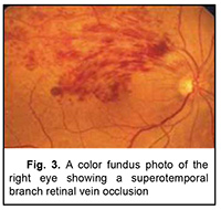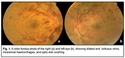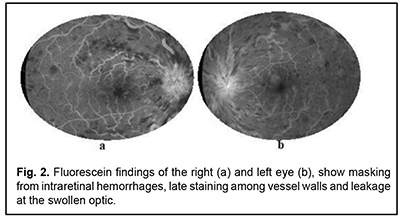 Introduction Crohn’s disease (CD) is an inflammatory bowel disease (IBD) of idiopathic etiolology. Extraintestinal manifestations are frequent. Almost every organ system may be affected [1]. Ocular manifestations during Crohn's disease are polymorphic and occur in about 10% of cases [2]. However, retinal vascular involvement associated with CD is uncommon [3]. We report the cases of two patients presenting a retinal vein occlusion associated with Crohn’s disease. Patient 1 A 27-year-old woman with a 5-year history of Crohn disease. She was in remission for eight months with the oral non-steroidal anti-inflammatory mesalazine. She presented with an acute exacerbation of symptoms and inflammation of the gastrointestinal tract. She was complaining of a concomitant sudden bilateral blurred vision. Visual acuity was 6/10 (Snellen) in her left eye and 4/10 in her right eye. A slit-lamp examination showed no abnormalities. Intraocular pressures were normal in both eyes. The fundus examination revealed disk oedema, retinal flame-shaped haemorrhages, sheathing of the retinal vessels in all four quadrants, and dilated retinal veins (Fig. 1). Fluorescein angiography revealed a prolonged retinal arteriovenous transit time, dilated and tortuous retinal veins, late staining of the vessel walls, and leakage from the disk (Fig. 2). The diagnosis of bilateral oedematous central retinal vein occlusion associated with CD was retained. The diagnosis of this disease was retained after an extensive diagnostic workup. She was treated with oral prednisolone and azathioprine. After 6 months, she improved visual acuity in both eyes. Patient 2 A 21-year-old man was diagnosed as having CD two years prior. At the current presentation, he had a mild disease activity treated by mesalazine. He presented with persistently decreasing vision in his right eye. His visual acuity was of 4/10 in the right eye and 10/10 in the left eye. The slit-lamp examination of both eyes was normal, as well as the fundus examination of the left eye. The fundus examination in the right eye revealed flame-shaped intraretinal haemorrhages located in the supero-temporal retinal quadrant with dilated and tortuous veins (Fig. 3). Etiologic investigations including the coagulation and the immune systems were normal. He was diagnosed with a branch retinal vein occlusion of the right eye associated with CD. Then, he was treated with high-dose intravenous methylprednisolone with a total resolution of his ocular disorder two months after the initial presentation. Discussion Crohn's disease is a multisystem disease. Almost every organ system may be affected [1]. Ocular findings during CD occur in about 10% of cases [2]. A variety of ocular lesions have been described. However, retinal vascular involvement is rare and only few cases of retinal vein occlusion have been reported [3]. Its physiopathology is not well elucidated. Initially, Knox has grouped it under coincidental ocular findings [4]. However, it has been suggested that retinal vein occlusion may depend on the severity of Crohn's disease [5]. In fact, a prothrombotic state may be seen in pro-inflammatory conditions such as IBD [6]. Coagulation abnormalities (increased concentration of coagulation factors) and alteration of vessel walls during IBD lead to a condition of thromboembolism which involves the systemic vasculature as well as retinal veins and /or arterie [7]. In addition, some authors reported that antiphospholipid and antineutrophil cytoplasmic antibodies predispose to vascular occlusive complications in inflammatory bowel diseases, independently of the intestinal activity [6,8]. In the presented cases, due to the young age, the improvement in ophthalmoscopic findings under corticosteroid therapy and in the absence of a clear etiology, the diagnosis of retinal vein occlusion associated with CD was made. There is not yet a well-established therapeutic consensus. According to Chen, 25% of untreated non-ischemic central retinal vein occlusion during IBD, resolved spontaneously at the end of one year [9]. In conclusion, inflammatory bowel disease should be considered among the causes of retinal vein occlusion especially in young patients and in absence of clear etiology. Early and regular ophthalmic examination is required in patients with IBD to establish an early diagnosis and to start an adequate treatment.