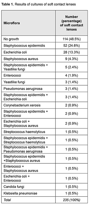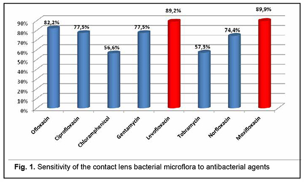 Pseudomonas aeruginosa was most commonly sensitive to ofloxacin (100.0%), ciprofloxacin (100.0%), and levofloxacin (100.0%), followed by norfloxacin (60.0%), moxifloxacin (60.0%), and gentamycin (40.0%), and not sensitive to tobramycin or chloramphenicol. Streptococcus haemolyticus was sensitive to ofloxacin, ciprofloxacin, gentamycin, levofloxacin, norfloxacin and moxifloxacin in all cases, and to chloramphenicol and tobramycin in 66.7% and 33.3%, respectively. Enterococcus was most commonly sensitive to moxifloxacin (87.5%), ciprofloxacin (87.5%), levofloxacin (87.5%), tobramycin (62.5%), gentamycin (50.0%), norfloxacin (50.0%), and chloramphenicol (50.0%). Yeastlike fungi were weakly sensitive to antifungal agents. They were most sensitive to itraconazol (30.0%) and clotrimazole (30.0%), followed by voriconazole (20.0%), ketoconazole (20.0%) and amphotericine B (20.0%), and not sensitive to nystatin. Candida fungi were sensitive to clotrimazole and nystatin, and resistant to itracon, amphotericine B, voriconazole and ketoconazole. On 32.5% of occasions, there was a difference in species isolated from conjunctival swabs and SCL swabs. Specifically, on 13.8% of occasions, there was no growth in the sample from SCL, but an organism (Staphylococcus epidermidis, 63.6%; Escherichia coli, 9.1%; Candida fungi, 9.1%; Staphylococcus aureus, 9,1%; and enterococci, 9,1%) was isolated from the conjunctiva. In addition, on 10.0% of occasions, there was no growth in the sample from the conjunctiva, but an organism (Staphylococcus epidermidis, 37.5%; Escherichia coli, 37.5%; and Staphylococcus aureus, 12.5%) was isolated from the SCL. We noted that, with Staphylococcus epidermidis isolated from the conjunctiva, pathogenic organisms were isolated from 5.1% of the relevant SCL (Escherichia coli, 2.5%; Pseudomonas aeruginosa, 1.3%; and yeastlike fungi, 1.3%). In addition, with Staphylococcus epidermidis isolated from the SCL, yeastlike fungi were isolated from 1.3% of the relevant conjunctival samples. Discussion According to Szczotka-Flynn L. B., only 26.1% had the same species detected on lenses and conjunctival swabs [9]. In our study, the same species were noted in 67.5% cases. Conjunctival swabs and SCL swabs harbored pathogenic microorganisms (Escherichia coli, Staphylococcus aureus, Streptococcus haemolyticus, Pseudomonas aeruginosa, yeastlike fungi and Candida fungi) on 26.2% and 26.9% of occasions, respectively, with Escherichia coli, Staphylococcus aureus being the two most commonly isolated pathogenic organisms. Our data were consistent with those of Iskeleli G. [4] demonstrating that there was no difference in organisms isolated from the conjunctiva and SCL in symptom-free SCL wearers. However, we detected no difference in the frequency of microflora. Based on our data and similar to Böhm M. R. R. [1], we recommend performing the microbiological analysis of both the conjunctiva and SCL in order to improve diagnosis, treatment strategies and outcomes. Since, on 32.5% of occasions, there was a difference in species isolated from conjunctival swabs and SCL swabs, we recommend microbiological studies of the conjunctiva and contact lenses in SCL wearers in order to avoid infectious complications and assign а proper treatment. Levofloxacin, moxifloxacin and gentamycin were found to be the most effective, whereas chloramphenicol and tobramycin were found to be the least effective antibacterial agents in SCL wearers. References 1.Böhm MR, Prokosch V, Merté RL, Koch R, Busse H, Stupp T. Böhm MR, et al. [Microbiological Analysis in Contact Lens-Associated Keratits]. Klin Monatsbl Augenheilkd. 228(9):808–14. German. 2.Willcox MD, Power KN, Stapleton F, et al. Potential sources of bacteria that are isolated from contact lenses during wear. Optom Vis Sci. 1997 Dec;74(12):1030-8. 3.Mowrey-McKee MF, Sampson HJ, Proskin HM. Microbial contamination of hydrophilic contact lenses. Part II: Quantitation of microbes after patient handling and after aseptic removal from the eye. CLAO J. 1992 Oct;18(4):240-4. 4.Boost MV, Cho P. Microbial flora of tears of orthokeratology patients, and microbial contamination of contact lenses and contact lens accessories. Optom Vis Sci. 2005 Jun;82(6):451-8. 5.Iskeleli G, Bahar H, Unal M, et al. Microbiologic evaluation of frequent-replacement soft contact lenses. CLAO J. 2002 Oct;28(4):192-5. doi: 10.1097/01.ICL.0000024118.45191.9B. 6.Yung MS, Boost M, Cho P, Yap M. Microbial contamination of contact lenses and lens care accessories of soft contact lens wearers (university students) in Hong Kong. Ophthalmic Physiol Opt. 2007 Jan;27(1):11-21. 7.Iskeleli G, Bahar H, Eroglu E, Torun MM, Ozkan S. Microbial changes in conjunctival flora with 30-day continuous-wear silicone hydrogel contact lenses. Eye Contact Lens. 2005 May;31(3):124-6.f. 8.Stapleton F, Willcox MD, Fleming CM, et al. Changes to the ocular biota with time in extended- and daily-wear disposable contact lens use. Infect Immun. 1995 Nov;63(11):4501-5. 9.Fleiszig SM, Efron N. Microbial flora in eyes of current and former contact lens wearers. J Clin Microbiol. 1992 May; 30(5): 1156–61. 10.Szczotka-Flynn LB, Bajaksouzian S, Jacobs MR, Rimm A. Risk Factors for Contact Lens Bacterial Contamination During Continuous Wear. Optom Vis Sci. 2009 Nov;86(11):1216-26. 11.Kozer-Bilgin L, Demir N, Altan-Yaycioglu R. Microbiological evaluation of contact lenses and contact lens disinfection solutions in an asymptomatic population and in medical personnel. CLAO J. 1999 Oct;25(4):228-32. 12.Thakue DV, Gaikwad UN. Microbial Contamination of Soft Contact Lenses & Accessories in Asymptomatic Contact Lens Users. Indian J Med Res. 2014 Aug;140(2):307-9. The authors certify that they have no conflicts of interest in the subject matter or materials discussed in this manuscript.