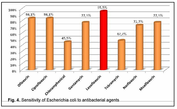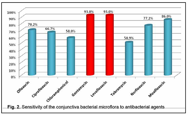 Among the identified pathogens, Staphylococcus epidermidis was the most common (47.1%, including 9.4% attributed to its combinations with pathogenic microflora), followed by Escherichia coli (24.6%), Staphylococcus aureus (9.4%), yeastlike fungi (5.8%), enterococci (5.8%), Pseudomonas aeruginosa (2.9%), Streptococcus haemolyticus (1.4%), Corynebacterium xerosis (1.4%), Candida fungi (0.7%), and Klebsiella pneumoniae (0.7%). The bacterial microflora cultured from SCL was most commonly sensitive to moxifloxacin (89.9%), followed by levofloxacin (82.9%); ofloxacin (82.9%), ciprofloxacin (77.5%); gentamycin (77.5%), norfloxacin (74.4%); tobramycin (57.3%), and chloramphenicol (56.6%) (Fig. 1).
