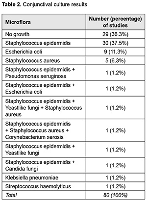 Organisms were isolated from the conjunctiva of 51 (63.8%) of 80 patients. Gram positive, Gram negative and fungal species were found in 75.0%, 20.0%, and 5.0%, respectively, of patients. Mixed microflora was evident in 14.1% of patients. Staphylococcus epidermidis was the most common (40.5%), followed by Escherichia coli (11.2%), Staphylococcus aureus (7.9%), yeastlike fungi (2.3%), Pseudomonas aeruginosa (1.1%), Candida fungi (1.1%), Klebsiella pneumoniae (1.1%), Streptococcus haemolyticus (1.1%), and Corynebacterium xerosis (1.1%) (Table 2).
