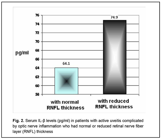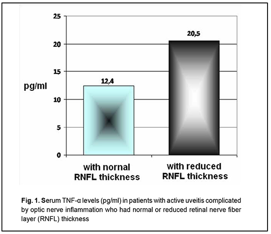 Introduction Tumor necrosis factor-alpha (TNF-α) and interleukin-1β (IL-1β) are important in the pathogenesis of uveitis, which is indicated by their increased levels in the aqueous humor [1-4], vitreous [5, 6], and serum [7-11] of patients with the disease. Aqueous humor TNF-α [1], serum TNF-α [10] and aqueous humor IL-1β [4] levels have been found to correlate with disease activity in uveitis. However, opinions vary regarding the role of TNF-α and IL-1β in optic nerve injury or lesion. Experimental studies have demonstrated that IL-1β promotes the induction of retinal autoimmune disease such as autoimmune uveoretinitis [12] and is involved in caspase-1-mediated cell death, known as "pyroptosis" [13]. In addition, an increase in TNF-α expression has been correlated with optic nerve injury [14]. Susceptibility to experimental autoimmune uveoretinitis (EAU) and endotoxin-induced uveitis (EIU) in vivo is correlated with the extent of TNF production by retinal Müller glia (RMG) and retinal pigmented epithelium (RPE) cell types under in vitro conditions [15]. Findings of retinal ganglion cell and optic nerve axon death after intravitreal administration of TNF-α have become the basis for a generally recognized experimental model of optic nerve degeneration [16-18]. The role of TNF-α in the development of retinal ganglion cell apoptosis has been demonstrated in the experimental corneal alkali burn model [19]. However, an experimental study by Mac Nair et al [14] found that TNF-α has an early protective effect on retinal ganglion cells after optic nerve crush. Obviously, the question requires further exploration. The purpose of this study was to assess serum TNF-α and IL-1β levels in patients with RNFL thinning in uveitis complicated by optic nerve inflammation. Material and Methods The study protocol complied with the tenets of the Declaration of Helsinki. Inclusion criteria were men and women aged 18 years or younger, with uveitis complicated by optic nerve inflammation. Exclusion criteria were diabetes; acute infections; cardiovascular diseases; abnormal circulation in the major ocular vessels; history of ocular surgery; pregnancy; or breast feeding. One hundred and thirty-two patients (53 men and 79 women) aged 18 to 74 years were involved in the study and underwent examination and treatment for uveitis complicated by optic nerve inflammation. The duration of uveitis ranged from one month to 14 years. Patients underwent a routine eye examination, including, but not limited to, ultrasound biomicroscopy and optical coherence tomography (OCT). Serum TNF-α and IL-1β levels were determined by commercially available enzyme-linked immunoassay kits. Sera of 40 healthy volunteers were used as controls. Statistica 6.1 software was used for the statistical analyses. Significance of differences was determined by Student’s t-test, Pearson’s chi-square or Fisher's Exact test, as appropriate. Mean values are presented as the mean ± standard error. Results The current and our previous studies [20] found that the serum TNF-α level in patients with active uveitis complicated by optic nerve inflammation was significantly increased compared with healthy donors (15.8 ± 1.02 pg/ml and 4.1 ± 1.52 pg/ml, respectively, p < 0.05). In addition, the serum TNF-α level in patients with RNFL thinning due to uveitis complicated by optic nerve inflammation (Fig. 1) was 1.5 times higher compared to patients with normal RNFL thickness (20.5 ± 1.24 pg/ml vs 12.4 ± 1.47 pg/ml, respectively, p < 0.05).