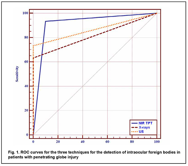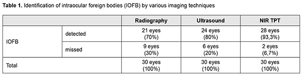 Introduction Penetrating globe injury is a leading cause of registered visual disability among working-age adults. Intraocular foreign bodies (IOFBs) account for 18%-41% of all penetrating globe injuries. The visual prognosis of an injury with an IOFB is determined by the size, composition, depth and location of the foreign body, and its duration in situ [1-3]. Endophthalmitis is one of the most severe potential complications of penetrating globe injury. Among patients with infectious endophthalmitis, post-traumatic endophthalmitis comprises about 10–30% of cases. Factors associated with increased risk of endophthalmitis following penetrating trauma include retained IOFB, delay in wound closure of >24 h and injury in a rural setting. Soil contamination is believed to result in a higher rate of endophthalmitis for open globe injuries occurring in a rural versus a non-rural setting. Endophthalmitis developed in 30% of patients with rural penetrating trauma, compared with 11% of patients with non-rural penetrating trauma [4, 5]. The incidence of endophthalmitis was higher after IOFB-related penetrating globe injury than after penetrating globe injury without IOFB [6]. Metallosis is a dangerous complication after metallic IOFB-related penetrating globe injury. It occurs through damage to intraocular tissue through toxic effects of retained metallic IOFB, these effects manifesting clinically as recurrent episodes of choroidal inflammation. Clinical manifestations developing as early as the first weeks after the traumatic event and cases of metallic foreign bodies presenting years after the initial trauma without causing severe ocular inflammatory response have been rarely reported [7-11]. Therefore, early detection of an IOFB is not only important for selecting the most appropriate surgical treatment strategy but also a factor influencing the treatment outcome. Despite continuous advances in imaging techniques, early detection of an IOFB is still a challenge for the ophthalmologist. Visualizing a ciliary body IOFB is especially challenging. Approximately 5% of IOFBs are found in the projection of or close to the ciliary body [3, 7]. Computed tomography (CT), radiography with the Komberg-Baltin prosthesis, ultrasonography and magnetic resonance imaging (MRI) are the most effective techniques for detecting and localizing an IOFB. Nevertheless, there are an ample number of reports of missed anterior chamber IOFBs [8, 10]. We have previously demonstrated that near-infrared transpalpebral transillumination (NIR TPT) is a modality enabling easy and non-invasive visualization and assessment of the sizes of ciliary body structures [11-13]. In addition, NIR TPT enables visualization of shadows of ciliary body IOFBs of various origin (metallic, stone and wood) in patients with penetrating globe injuries. The use of NIR TPT as means for visualizing an IOFB in conjunction with traditional imaging modalities seems promising and would improve our ability to diagnose these patients preoperatively [14-16]. The purpose of the study was to compare detection rates of near-infrared transpalpebral transillumination, ultrasonography and radiography for foreign bodies situated in the anterior segment of the eye. Material and Methods This was an open-label, prospective and non-interventional study. This study was performed within the framework of a planned research design and the study protocol was approved by the Bioethics Committee of the Filatov Institute. The study followed the ethical standards stated in the Declaration of Helsinki, the European Convention on Human Rights and Biomedicine and relevant laws of Ukraine. Informed consent was obtained from all study subjects. Thirty male patients (30 eyes; age, 21 to 65 years) with penetrating globe injuries and suspected foreign body in the anterior segment of the eye (the anterior chamber, lens, anterior vitreous cavity) were under our observation. They underwent visual acuity assessment, biomicroscopy, ophthalmoscopy, metal detector examination, anteroposterior and lateral radiography (both with and without using the Komberg-Baltin prosthesis), ultrasound biometry, ultrasound scanning of the anterior eye and posterior eye; ultrasound distant perimetry; metal detector examination; and NIR TPT. A diagnosis of IOFB was confirmed or denied by the three imaging modalities (NIR TPT, ultrasound scanning and X-ray examination) using the signs that were specific for each of the modalities. The NIR TPT system used consisted of (1) a wireless infrared light-emitting-diode light source with a dominant wavelength of 940 nm and (2) slit-lamp attachable monochrome video camera (Blackfly®, FLIR Integrated Imaging Solutions Inc., Canada) capable of recording NIR images and video [14, 15, 17]. The transpalpebral illumination study was performed with the patient sitting at the slit lamp. Images of scleral shadows of the IOFB, pars plicata and pars plana were taken and saved in the computer. We used the Aviso ultrasound (Quantel Medical; Cournon d'Auvergne, France) with 10-MHz and 50-MHz linear probes for the posterior and anterior segments of the eye, respectively. The ultrasound study was performed with the patient lying on his back, and with the head of the bed raised. In the ultrasound study with the anterior probe, patients were administered topical anesthesias with ophthalmic 0.5% proparacaine hydrochloride (ALCAINE®, SA Alcon-Couvreur NV, Puurs, Belgium), and, subsequently, Vidisic Eye Gel (Dr. GERHARD MANN Chem.-Pharm. Fabrik, Berlin, Germany) as a contact gel. The posterior probe was placed over the patient’s closed eyelid to scan the eye non-invasively. Targeted anteroposterior and lateral radiography (with the Komberg-Baltin prosthesis) was performed using a Proteus XR/a radiography system (GE Healthcare, Milwaukee, Wis), and patients were administered topical anesthesias with ophthalmic 0.5% proparacaine hydrochloride (ALCAINE®). Contact invasive imaging studies (