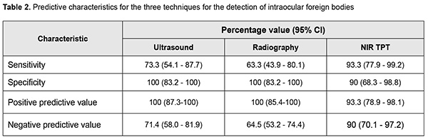 The area under curve (AUC) for NIR TPT was 0.92 (95% CI, 0.80–0.98); for radiography, 0.82 (95% CI, 0.68–0.91), and for ultrasound, 0.87 (95% CI, 0.74–0.95), demonstrating good efficacy of all the three IOFB detection methods, although there was no significant difference (p > 0.05) in AUC between each two of them. Table 2 shows predictive characteristics of the methods under analysis.