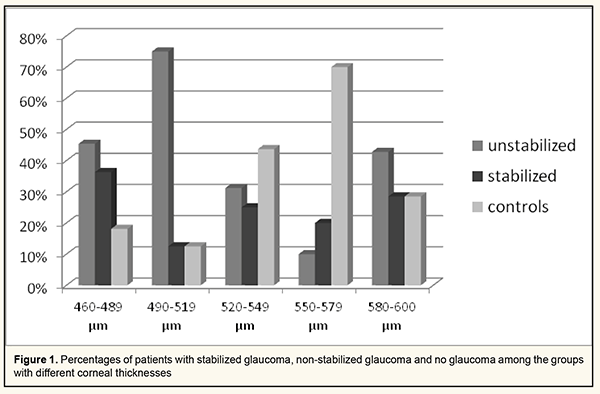 Discussion Determining a target IOP and establishing and using a link between the target IOP and an objective characteristic like the corneal thickness, corneoscleral rigidity or axial length is a major task in glaucoma management. In the current study, we determined mean values for IOP readings obtained by different tonometers at different central corneal thicknesses. Group 1 (corneal thickness, 460-489 μm; mean corneal thickness, 479 ± 7.2 μm) patients with stabilized glaucoma had the highest mean values for IOP obtained by any of the three methods at which no glaucoma progression was observed during the most recent 6 months. In these patients, mean IOP was 16.9 ± 1.2 mmHg for Pascal DCT, 16.2 ± 1.4 mmHg for ICare tonometry, and 20 ± 0.8 mmHg for Maklakoff applanation tonometry. That is, for patients with the thinnest cornea (corneal thickness, 460-489 μm), these Pascal DCT, ICare tonometry, Maklakoff applanation tonometry IOP readings may be considered target IOP values. There was a significant difference (р < 0.05) in Maklakoff applanation tonometry IOP, but not in Pascal DCT or ICare tonometry, between group 1 patients with non-stabilized glaucoma (23.8 ± 2.0 mmHg) and those with no glaucoma (16.5 ± 0.7 mmHg). In addition, there was no significant difference (р > 0.05) in Maklakoff applanation tonometry IOP, Pascal DCT or ICare tonometry between patients of other groups with glaucoma and those with no glaucoma. This may indicate that Maklakoff tonometry measurements are more sensitive than Pascal DCT or ICare tonometry measurements in patients with thinner corneas. This is likely due to the fact that tonometers measuring true IOP may overestimate IOP if IOP ≥ 20 mmHg. The results obtained are understandable given that, in group 1 patients with non-stabilized glaucoma, mean IOP was 25.2 ± 6.6 mmHg for Pascal DCT, 26.0 ± 7.5 mmHg for ICare tonometry, and 23.8 ± 2.0 mmHg for Maklakoff applanation tonometry. The manufacturer of Icare ІС 200 estimates the measurement error to be no more than 1.2 mmHg for IOP ≤ 20 mmHg and no more than 2.2 mmHg for IOP ≥ 20 mmHg. This is in agreement with findings of a study by Volkova and colleagues [21], who reported a significant magnitude of difference in IOP measurements in the high normal IOP range for Icare tonometry, and more accurate IOP measurements in this range for Maklakoff applanation tonometry. In the current study, the highest IOP readings were observed in patients of group 5 (corneal thickness, 580–600 μm; mean corneal thickness, 593 ± 4.3 μm) with non-stabilized glaucoma: mean IOP was 28.1 ± 15.0 mmHg for Pascal DCT, 33.2 ± 21.1 mmHg for ICare tonometry, and 25.3 ± 7.5 mmHg for Maklakoff applanation tonometry. However, the greatest standard deviations of IOP measurements were also noted in patients of this group. These findings confirm those of others that eyes with thicker corneas have higher IOP readings [22]. However, given that the highest IOP readings and the greatest standard deviations of IOP measurements were noted in non-stabilized glaucoma patients from the group with the thickest corneas, the sensitivity of true IOP measurements (for Pascal DCT, and ICare tonometry) and tonometric IOP measurements (for Maklakoff applanation tonometry) decreases with increases in IOP and corneal thickness. This should be taking in account while setting a target IOP for glaucoma patients. Among the groups with different corneal thicknesses (groups 1 to 5), group 2 (corneal thickness, 490 – 519 μm) had the highest percentage of patients with non-stabilized glaucoma (75%), followed by group 1 (corneal thickness, 460 – 489 μm; 45.4%) (Figuree 1). This is in agreement with findings of others that thin cornea is a risk factor for glaucoma progression, because IOP is underestimated in eyes with thinner corneas, leading to overdiagnosis of glaucoma [22, 23]. Therefore, the corneal thickness influences IOP measurements, and sensitivity of the tonometry methods under study decreased with increases in corneal thickness and IOP. Maklakoff applanation tonometry had the highest accuracy compared to Pascal DCT and ICare tonometry, but only for patients with thin cornea (460 – 486 μm). Thin cornea is a risk factor for glaucoma progression, and IOP is underestimated in eyes with thinner corneas, leading to overdiagnosis of glaucoma. These should be taken in account while selecting a target IOP for glaucoma patients. References 1.Weinreb RN, Liebmann J, World Glaucoma Association. Medical Treatment of Glaucoma: The 7th Consensus Report of the World Glaucoma Association. Kugler Publications: Amsterdam; 2010. 2.Boriskina LN. [Campimetric method for measuring the individually tolerated intraocular pressure in primary open-angle glaucoma]. In: [Aktualnyie voprosy eksperimentalnoi i klinicheskoi meditsiny]. Volgograd: VGMI; 1981. p.146-7. Russian. 3.Fokin VP, Balalin SV. [Determining target intraocular pressure in patients with primary open-angle glaucoma]. Glaucoma. 2007;4:16-20. Russian. 4.Fokin VP, Balalin SV. [Study of optic nerve intolerance to compressive ocular hypertension by computer-aided suprathreshold static perimetry in patients with glaucoma, pseudoglaucoma and ocular hypertension]. Glaucoma. 2008;2:3-8. Russian. 5.Fokin VP, Balalin SV. [Modern organizational and medical technologies in the diagnosis and treatment of primary glaucoma]. Oftal'mokhirurgiia. 2011;(2):43-9. Russian. 6.The Advanced Glaucoma Intervention Study (AGIS): 7.The relationship between control of intraocular pressure and visual field deterioration. The AGIS Investigators. Am J Ophtalmol. 2000;4:429-40. 7.[National guidelines for glaucoma for medical practitioners]. Egorov EA, Astakhov YS, Yerichev VP, editors. 3rd ed. Moscow: GEOTAR-Media; 2015. Russian. 8.Volkov VV. [Open-angle glaucoma]. Moscow: Meditsinskoie informatsionnoie agenstvo; 2008. Russian. 9.Nesterov AP. [Glaucoma]. Moscow: Meditsinskoie informatsionnoie agenstvo; 2008. Russian. 10.