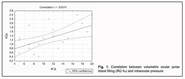 Volumetric ocular pulse blood filling positively correlated with IOP (r=0.5; p < 0.05) in patients with uncomplicated RRD as well as patients with RRD complicated by CD (Fig. 1).