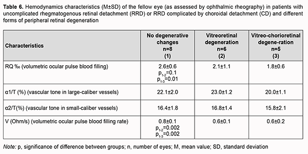 In patients with uncomplicated RRD or RRD complicated by CD, volumetric ocular pulse blood filling value in the fellow eye without focal fundus pathology was 2.6 ± 0.6‰, which was 18.7% (p = 0.0001) lower than the norm (Table 6). In addition, the mean volumetric ocular pulse blood filling value in the fellow eye with vitreoretinal degeneration or vitreochorioretinal degeneration was 2.0 ± 0.9‰, which was 37.5% (p = 0.0001) lower than the norm. Moreover, the mean volumetric ocular pulse blood filling value in the fellow eye with peripheral vitreochorioretinal degeneration was 31% (p = 0.01) lower than in the fellow eye without focal fundus pathology.