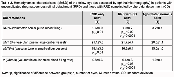 No significant difference in vascular tone was observed. Volumetric blood filling rate in the fellow eye without focal fundus pathology was 25% and significantly (p = 0.002) higher than in peripheral retinal degeneration. Discussion The two groups of patients included in this study (the group of patients with uncomplicated RRD and the group of patients RRD complicated by CD) were practically homogeneous with regard to age, time from the onset of RRD and ocular comorbidity. More than three breaks were detected significantly more commonly (χ2 =3.7, p = 0.05) in patients with RRD complicated by CD than in patients with uncomplicated RRD (45.5% vs 9%). This is in agreement with a study by Gu and colleagues [7] who found that, of the eyes with RRD complicated by CD, 34.62% presented with multiple holes (p = 0.044) and 25.00% with macular holes (p = 0.012), compared with 20.66% and 14.08% for eyes with RRD only. Of note that we failed to observe an association of CD with gender, age, time from the onset of RRD, and history of general medical conditions like hypertension. There are several works on blood supply disturbances in RRD complicated by CD, but they are mostly related to OCT angiography, i.e., structural changes in choroidal layers [20]. We found blood filling deficiency in the affected eye and the fellow eye both in patients with RRD complicated by CD and in patients with uncomplicated RRD. In addition, blood filling deficiency characteristics for the affected eye and the fellow eye in patients with RRD complicated by CD (68.7% and 40%) were twice as high as those in patients with uncomplicated RRD (33.3% and 27%, respectively). Moreover, we found the volumetric ocular blood filling rate in patients with RRD complicated by CD to be half of that in age-matched normals. Our findings demonstrate significant ocular blood supply disturbances in RRD in general, and especially in RRD complicated by CD. This also indicates that uncomplicated RRD or RRD complicated by CD is accompanied by significant hypoxia that affects not only the retina, but also other ocular coats, e.g., the choroid (particularly, the layer of large and middle choroidal vessels and the choriocapillaris layer). We believe that it is in agreement with a study by Xu and colleagues [20] who demonstrated that the area of the deep plexus foveal avascular zone continued to enlarge for three months after retinal reattachment in eyes with RRD complicated by CD. In addition, we found volumetric ocular pulse blood filling to be positively correlated with IOP (r=0.5; p < 0.05) in patients with uncomplicated RRD as well as those with RRD complicated by CD. A reduction in IOP in an uncomplicated retinal detachment is caused by increased RPE pumping. In an RRD complicated by CD, the above mechanism is joined by the hypotony associated with an inflammatory choroidal detachment and frequently inflammatory ciliary body detachment. It remains an open question whether marked hypotony precedes or follows choroidal detachment [23-25]. Therefore, the lower the IOP, the more apparent blood filling deficiency, or it may be vice versa (i.e., the more apparent ocular blood filling deficiency), and this creates a vicious circle of pathology that should be broken by means of surgical treatment as well as pharmacological correction. The differences in volumetric ocular pulse blood filling (Δ RQ) and in volumetric ocular pulse blood filling rate (Δ V) between the affected eye and the fellow eye were similar in the uncomplicated RRD group and the RRD complicated by CD group. What is important is that the volumetric ocular pulse blood filling value and the volumetric ocular pulse blood filling rate in the fellow eye with vitreoretinal degeneration or vitreochorioretinal degeneration were 37.5% lower than the norm and half of the norm, respectively. That is, it is likely that the state of the blood supply to ocular tissues (particularly, retinal and choroidal tissues) before severe structural injury in RRD complicated by CD occurs is important. This hypothesis requires further research, possibly involving studies on the state of brain vessels.