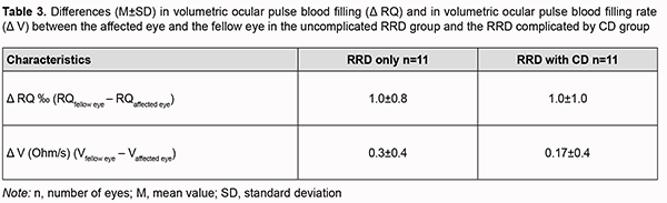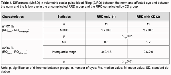 Therefore, ocular blood circulation was also impaired in the fellow eye of patients with RRD complicated by CD, with volumetric ocular pulse blood filling and OPBF rate being 40% lower than in age-matched normals. In addition, volumetric ocular pulse blood filling and OPBF rate in the fellow eye of patients with RRD complicated by CD were 27% (p=0.02) and 25% (p=0.06), respectively, lower than in the fellow eye of patients with uncomplicated RRD (Table 2). The differences in volumetric ocular pulse blood filling (Δ RQ) and in volumetric ocular pulse blood filling rate between the affected eye and the fellow eye (Δ V) were similar in both groups (Table 3). The differences in volumetric ocular pulse blood filling between the norm and the affected eye (Δ1RQ ‰) and between the norm and the fellow eye (Δ2RQ ‰) in group 2 were 23% larger (p = 0.01) and 2.4-fold larger (p = 0.01), respectively, than in group 1. This confirms that blood filling deficiency in the affected eye and the fellow eye was more severe in patients with RRD complicated by CD than in patients with uncomplicated RRD (Table 4).
