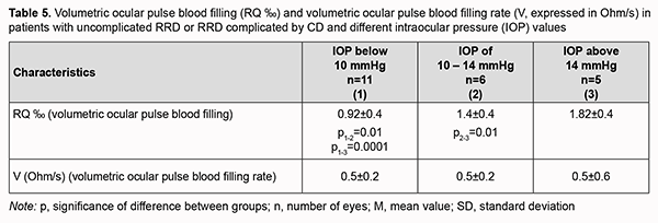 We identified three groups of study patients with IOP values below 10 mmHg (IOP_1 group, 11 eyes), 10-14 mmHg (IOP_2 group, 6 eyes), and above 14 mmHg (IOP_3 group, 5 eyes), to consider blood circulation in the affected eye in all patients with uncomplicated RRD or RRD complicated by CD and different IOP levels. We found that patients with IOP below 10 mmHg in both eyes had the lowest mean volumetric ocular pulse blood filling value (0.95 ± 0.4 ‰), which was 32% (p = 0.01) lower than in patients with IOP of 10-14 mmHg and 1.9-fold lower than in normal IOP (1.82 ± 0.4 ‰). Of note that volumetric ocular pulse blood filling (RQ) value in patients with IOP of 10-14 mmHg was 22.2% (p = 0.01) lower than in normal IOP (Table 5).