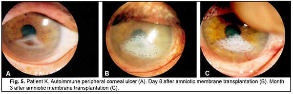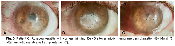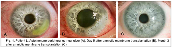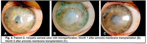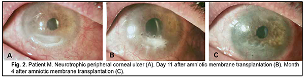 Introduction Severe corneal inflammatory disease and ocular trauma and burns can result in corneal ulceration and perforation, leading to severe conjunctival cicatricial changes, corneal leucoma and substantial visual acuity loss. Local ocular tissues, autografts and donor grafts are commonly used for the treatment of this severe ocular pathology. One of these is the amniotic membrane (AM) which has a variety of unique features and is used in eye surgery [1-3]. Numerous studies demonstrated that AM promotes epithelialization, maintains normal epithelial phenotype, reduces inflammation and scar tissue formation, improves adhesion between tissues, inhibits corneal neovascularization, and has antimicrobial properties [4-6]. The first documented ophthalmological application of the amniotic membrane was in the 1940s [7], but only since 1995 amniotic membrane transplantation (AMT) has been widely used to treat a variety of conditions of the anterior segment of the eye [8-11]. At present, AMT has a role in reconstructive surgery of the ocular surface [12-15] due to its unique properties. The list of indications for the use of AMT in ophthalmology grows year by year [13, 16, 17]. These indications can be divided into such categories as corneal surface reconstruction, conjunctival surface reconstruction, employment as a scaffolding material (in tissue engineering applications), glaucoma, corneomalacia, scleromalacia, etc. There are three major techniques for AMT: ‘onlay’ (‘patch’) technique, ‘inlay’ (‘multilayer transplantation’) and ‘sandwitch’ technique (a combination of the two techniques mentioned before). The ‘onlay’ (‘patch’) technique has been designed to use the AM as a temporary natural patch for the entire surface of the cornea [5]. In the onlay technique, the AM usually dissolves by itself within one to two weeks, as opposed to the multilayer transplantation technique, in which the AM is left over the cornea for life. Indications for the use of this technique vary from acute burns of the eye to acute herpetic keratitis and acute Stevens-Johnson syndrome [6, 18]. The anti-inflammatory properties of the AM are used in this case, but they are efficacious for a limited period of time [19]. Patients with slow epithelialization of the corneal defect may require repeated dressing with the AM [20]. The orientation of the AM plays only a minor role with this surgical procedure, and, most commonly, the AM is secured to the cornea with episcleral or bulbar conjunctival sutures [21]. Dietrich and colleagues [22] have proposed simultaneous AMT in emergency penetrating keratoplasty (PK) as a therapeutic option for corneal destruction, when PK only is accompanied by an increased risk of graft rejection. During the inlay (or multilayer transplantation) procedure, the wound is debrided and the AM is applied with its epithelial/basement membrane side facing upward, then sutured into place with 10-0 nylon sutures. The AM serves as a permanent substitute for the basement membrane; as such, neighboring recipient epithelial cells eventually migrate onto the AM and integrate it into the host cornea. In deep defects, multiple amniotic membranes can be used. Epithelialization of the AM integrates AM into the host tissue. The major indications for this method are persistent epithelial defects, corneal ulceration or to cover defects following excision of conjunctival tumors [23]. The combination (or sandwich) technique is a combination of the two described above and is used mainly in serious disorders of the ocular surface such as deep and extensive corneal ulceration, or in keratoplasty with a high risk of host immune rejection [3]. The main purpose of the onlay is to protect the inlay and promote its epithelialization [8]. This method is favored due to its high success rate (65% to 80%), low rate of recurrence of viral keratitis and persistant epithelial defects (approximately 20% to 35%) [24] and suppression of corneal neovascularization. The purpose of this study was to improve the multilayer amniotic membrane transplantation technique. Material and Methods The proposed surgical technique First, the operative field was cleansed with 0.5% chlorhexidine in alcohol. Epibulbar anesthesia with ophthalmic 0.5% proparacaine hydrochloride (ALCAINE®, SA Alcon-Couvreur NV, Puurs, Belgium) was administered. Dry sulfacyl sodium was administered, if required. A scraper was applied to form a graft bed and remove functionally incompetent epithelial cells. The defect margins were outlined with a marker. A graft of two or more layers was formed from the cryopreserved amniotic membrane by folding the amnion several times onto itself, and the graft was fixed with interrupted 10-0 nylon sutures to the margins of the defect. In all cases, during the surgical procedure, 10-0 nylon interrupted suturing was done in a routine manner, approximately at one half of the corneal thickness. Antiseptic solution was instilled in the conjunctival sac. A soft therapeutic contact lens was placed onto the ocular surface. Dexamethasone and antibiotic injection was administered parabulbarly. Finally, an aseptic monocular patch was placed on the eye. Twenty eight patients with corneal ulcers of different causes underwent amniotic membrane transplantation. There were 17 men (60.7%) and 11 women (39.3%). Mean patient age (SD) was 51.3 (0.81) years. Corneal ulcers were categorized based on the etiology as herpetic (7/28, 25%), neurotrophic (10/28, 35.7%), bacterial (3/28, 10.7%), fungous (2/28, 7.2%), autoimmune (3/28, 10.7%) and those caused by rosacea (3/28, 10.7%). Corneal disease etiology was determined on the basis of history (a recurrent disease course in case of viral keratitis), microbiological study (bacterial of fungal keratitis), corneal sensation assessment (neurotrophic keratitis), presence of general medical condition (autoimmune disease), and/or dermatologist's statement. In most cases (90%), ulcers were of