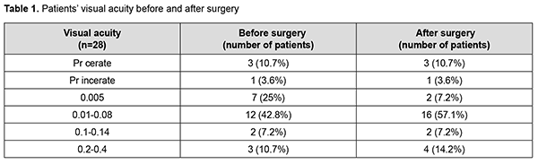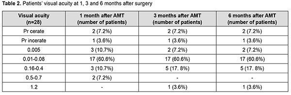 Two-layer amniotic membrane graft was used during surgery in 27 patients (96.4%), and three-layer amniotic membrane graft, in one patient (3.6%). At discharge, the conjunctiva was pink in 24 patients (85.7%), and moderately hyperemic in 4 patients (14.3%). In addition, corneal stromal edema was moderate in 25 patients (89.2%), apparent in 2 patients (7.2%) and no edema was seen in one patient (3.6%). The amniotic graft was unaffected in 26 patients (92.8%) and appeared partially lysed in 2 patients (7.2%). Moreover, it was semitransparent in all the 28 patients (100%). At discharge, visual acuity was 0.005 in 2 patients (7.2%), 0.01 to 0.08 in 16 patients (57.1%), 0.1 to 0.14 in 2 patients (7.2%), and 0.2 to 0.4 in 4 patients (14.2%). Visual acuity in the affected eye was accurate light projection in 3 patients (10.7%), and inaccurate light projection in one patient (3.6%). At 1 month after surgery, the amniotic membrane was unaffected in 26 patients (92.8%) and appeared partially lysed in 2 patients (7.2%). In addition, visual acuity was 0.005 in 3 patients (10.7%), 0.01 to 0.08 in 17 patients (60.6%), 0.16 to 0.4 in 3 patients (10.7%), and 0.5 to 0.7 in 2 patients (7.2%). Visual acuity in the affected eye was accurate light projection in 2 patients (7.2%), and inaccurate light projection in one patient (3.6%). Table 2 shows changes in visual acuity over time in study patients. At 1 month after surgery, corneal surface was epithelialized in 25 patients (89.3%), and corneal epitheliopathy was seen in 3 patients (10.7%). Vascularization of the limbus was seen in 15 patients (53.5%), vascularization of two corneal quadrants, in 11 patients (39.3%), total corneal vascularization, in 1 patient (3.6%), and no corneal vascularization, in 3 patients (10.7%). Punctuate infiltration of the cornea was noted in 1 patient (3.6%) and no corneal infiltration, in 27 patients (96.4%). Corneal stromal edema was seen in 24 patients (85.7%) and no corneal stromal edema, in 4 patients (14.3%).