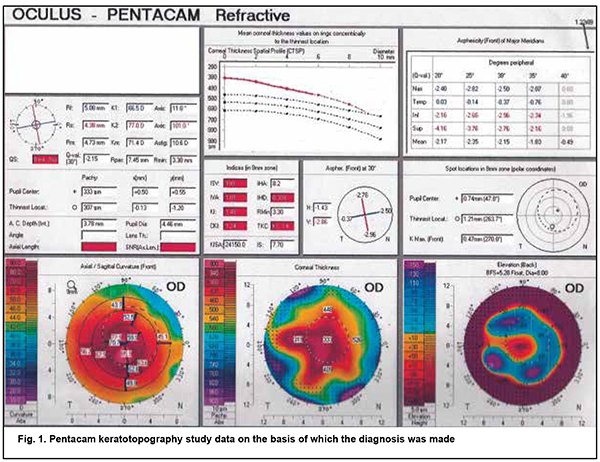 http://doi.org/10.31288/oftalmolzh202225456 Received: 06 Janurary 2022; Published on-line: 30 April 2022 Performing DALK complicated by Descemet's membrane macroperforation in keratoconus without conversion to penetrating keratoplasty: a case report V. N. Serdiuk ¹, N. G. Klopotskaya ¹, S. B. Ustimenko ², Ye. N. Maidenko ², Ye. B. Storozhenko ², V. V. Tikhomirova ² 1 Dnipro State Medical University; Dnipro (Ukraine) 2 Dnipropetrovsk Regional Clinical Ophthalmological Hospital; Dnipro (Ukraine) TO CITE THIS ARTICLE: Serdiuk VN., Klopotskaya NG., Ustimenko SB., Maidenko YeN, Storozhenko YeB, Tikhomirova VV. Performing DALK complicated by Descemet's membrane macroperforation in keratoconus without conversion to penetrating keratoplasty: a case report. J.ophthalmol.(Ukraine).2022;2:54-6. http://doi.org/10.31288/oftalmolzh202225456 We report a case of successful deep anterior lamellar keratoplasty (DALK) for kearatoconus in the presence of intraoperative Descemet's membrane (DM) macroperforation in a 10-year boy. Intraoperative optical coherence tomography–guided femtosecond laser-assisted DM separation from the periphery to the center facilitated keeping the anterior chamber angle open and avoiding a subsequent increase in intraocular pressure. In addition, the size of the graft was made 0.4 mm larger that the size of the trephination hole, which enabled fitting of the graft margins and trephination margins, whereas precise deep femtosecond laser corneal dissection enabled (a) preventing a shock wave effect from the laser pulses and (b) DM adherence to the stroma of the graft. At 5 months after surgery, uncorrected visual acuity (UCVA) was 0.5; keratometry values OD were R1, 7.67 mm; К1, 44.0 D; R2, 7.30 mm; К2, 46.2 D; Rm, 7.48 mm; Km, 45.1 D; and Astig, 2.2 D. Anterior chamber angle was 41.4º. The DM adhered well to the donor stroma, the DM defect was practically not visualized on imaging, and endothelial cell density was 2719 cells/mm2 in the operated eye. At 7 months after surgery, the patient’s UCVA was 0.6 OD and corrected visual acuity with a spherical equivalent of +3.0 D was 0.9. Keywords: deep anterior lamellar keratoplasty, Descemet's membrane macroperforation Keratoconus is a non-infectious degenerative condition with lesions of the corneal stromal collagen matrix in which the normally round and regular shape of the cornea progressively thins and bulges until it is a cone-like, irregular shape. The reported incidence varies from 1:2,000 to 1:500,000 [3]. Corneal transplantation (or keratoplasty) is still the only treatment for late-stage keratoconus. Deep Anterior Lamellar Keratoplasty (DALK) is a widely recognized treatment for keratoconus, and makes it possible (a) to avoid the complications (e.g., postoperative glaucoma) characteristic of penetrating keratoplasty (PK) [3, 4, 5] and (b) to preserve patient’s endothelial cells. The endothelial cell loss (ECL) is more intensive during 6 months after DALK (10%), and remains almost constant thereafter until month 12, whereas PK patients exhibit an ECL of 33-43% over 12 months. However, DALK is a more difficult procedure to perform than PK, and intraoperative Descemet's membrane (DM) tear (microperforation or macroperforation) can occur with DALK, requiring conversion to PK. The rate of conversion from DALK to PKP due to loss of the integrity of DM varies from 2.9% to 23% and depends on the surgeon’s experience, ability to successfully bare the DM, and indication for keratoplasty [3, 5]. The case becomes even more complicated when a large DM tear occurs at an early stage of stromal dissection, before complete baring of DM or before reaching a satisfactory pre-descemetic plane. Dissecting the remaining thick residual stromal layer will apply more traction forces on the edges of the tear making the conversion to PKP very likely [1]. The management of DM perforation includes intracameral air tamponade, stromal patching, fibrin glue and suturing of the defect [1, 2, 5]. Most DALK surgeons are now in agreement that DALK can still be successfully completed with almost all microperforations (less than one quarter of the cornea) using air/gas tamponade for DM apposition to the donor cornea. There is no, however, agreement on whether DALK can still be successfully completed with macroperforations. Some authors believe that in cases where the surgeon encounters macroperforations (greater than one quadrant of the cornea), it may not be easy to complete the dissection of the posterior lamella fully up to the Descemet's or pre-Descemet's region, and, in such cases, better visual and refractive outcomes are achieved by converting the procedure to a full thickness PK [5]. Others [1, 4], however, have reported on eyes with large DM tears in which DALK was successfully completed. A boy of 10 years diagnosed with grade 4 keratoconus OD was under our care. In autumn of 2020, he was found to have reduced vision. The family history was significant for an elder brother with keratoconus. The boy was born from the fourth pregnancy and was the fourth child of his mother. He had no concurrent general medical condition. The diagnosis was based on the results of keratotopography study of the right eye using Pentacam (Oculus, Wetzlar, Germany) (Fig. 1). Prior to surgery, uncorrected visual acuity (UCVA) was 0.02 OD; intraocular pressure (IOP) as assessed by pneumotonometry, 14 mmHg; and corneal thickness OD as assessed by keratopachymetry, 293 µm. In addition, the eye was quiet and exhibited Haab's striae and the cornea thin and cone-shaped.