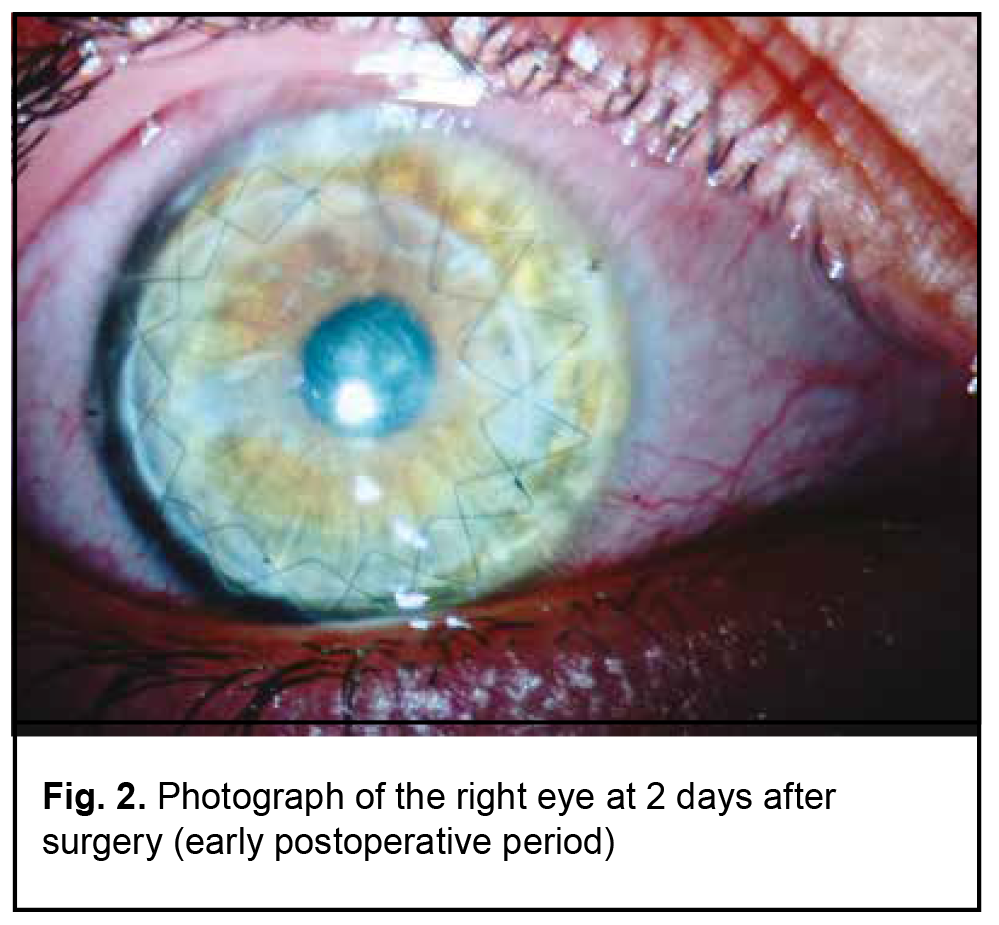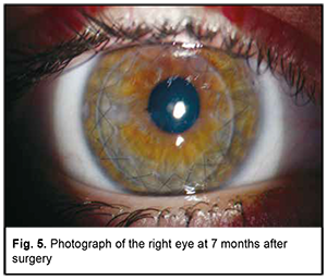 At 7 months after surgery, the patient’s UCVA was 0.6 OD and corrected visual acuity with a spherical equivalent of +3.0 D was 0.9. Fig. 5 shows right eye in the late period (7 months) after surgery.