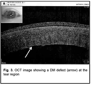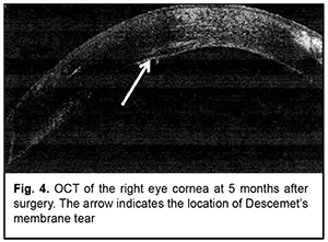 On July 15, 2021, the boy received femtosecond laser-assisted DALK surgery with the use of keratobioimplant. Intraoperative optical coherence tomography (OCT)–guided Victus® femtosecond laser (Bausch & Lomb)–assisted corneal dissection was performed using the following laser settings: spot spacing, 2 µm; energy, 1.8 nJ per pulse for the receipient and 1.9 nJ per pulse for the donor; side cut angles, 90° for the receipient and 92-97° for the donor; pulse duration, 600 to 800 femtoseconds. The size of the graft was made 0.4 mm larger that the size of the trephination hole (anterior and posterior diameters of the cornea were 8.4 mm and 8.0 mm, respectively, for the recipient, and 8.8 mm and 8.1 mm, respectively, for the donor). Therefore, the profile of the graft cut facilitated placing the graft into the recipient bed like a watch glass. The AE-4210 forceps were used to strip the Descemet membrane from the donor cornea. The surgical microscope (HS Hi-R NEO 900A NIR, Haag-Streit Surgical GmbH & Co. KG, Wedel, Germany) with an intraoperative OCT (iOCT) system was used intraoperatively, which enabled to assess the trephination depth; visually monitor the insertion of the 27-gauge air injection cannula (Fogla 27G Air injection cannula, Storz Ophthalmics, USA) using the Big Bubble technique; assess the residual stromal thickness; and detect any residual space in the graft-host interface at the end of DALK surgery. During injection of a gas bubble into the anterior chamber, due to marked corneal thinning and corneal cicatrization, there was a gas pressure-induced linear rupture in the Descemet's membrane along the optical zone, practically along an entire diameter of the cornea (7.9 mm), but there was no collapse of the anterior chamber. Because the anterior chamber was still stable, the surgeon continued performing careful iOCT-guided separation of the stroma from the DM from periphery to the center, while trying to minimize tractions at the margins of the tear. This approach made it possible to bare the entire Descemet's membrane and to form the trephination bed with a correct angle between the stroma and DM, without the excessive stromal tissue, which, in turn, allowed preventing a shock wave effect from the laser pulses. The keratobioimplant was placed on the recipient cornea and sutured with two running stitches. A 10% perfluoropropane gas mixture was introduced into the anterior chamber at the end of DALK surgery. Postoperatively, the patient received systemic immunosuppressive/ anti-inflammatory therapy with corticosteroids, topical antibacterial therapy with fluoroquinolones, and reparative therapy for 2 weeks on the in-patient basis. In addition, the anti-inflammatory and reparative therapy was continued on the out-patient basis for 4 months after he was discharged home. At 2 days after surgery, UCVA was 0.1 OD, the right eye appeared irritated, and the graft was transparent. Fig. 2 shows the affected eye at 2 days after surgery (early postoperative period). The OCT image showed a DM defect at the tear region (Fig. 3).
