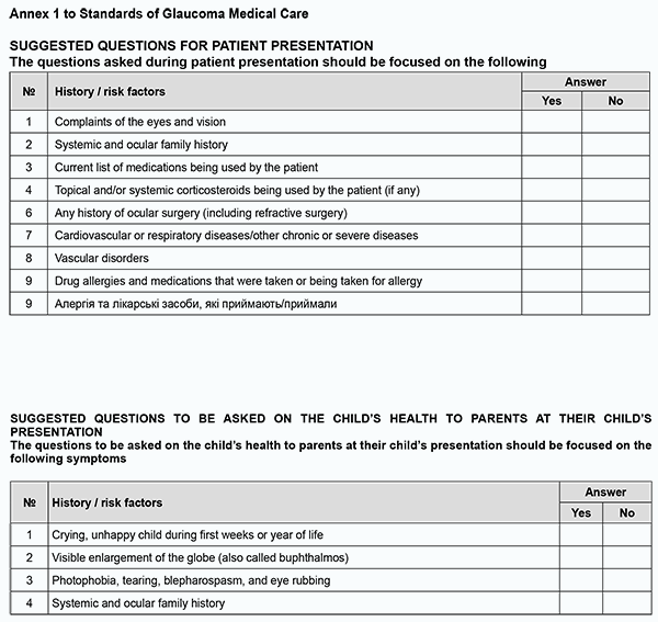 TO CITE THIS ARTICLE: Standards of glaucoma medical care. J.ophthalmol.(Ukraine).2022;4:75-81. http://doi.org/10.31288/oftalmolzh202247581 General International Classification of Diseases, 10th Revision (ICD-10) code for glaucoma = H40-H42 Developed by: Z.F. VeselovskaAcademician of NAMS of Ukraine, Dr Sc (Med), Professor and Chair of Surgical Disease Department No.2 at the Kyiv Medical University, a private higher education establishment, and President of the Ukrainian Glaucoma Society Paul HarasymowyczMD, Professor at the University of Montreal and Medical Director of the Montreal Glaucoma Institute and Bellevue Ophthalmology Clinics, Montreal, Canada Ilgaz YalvacDM, Professor of Ophthalmology at Yeditepe University School of Medicine; Director of the Istanbul Eye Center; President of the Turkish Glaucoma Society P.A. BezditkoDr Sc (Med), Professor and Chair of Ophthalmology at the Kharkiv National Medical University, and Vice President of the Ukrainian Glaucoma Society N.F. BobrovaDr Sc (Med), Professor, Head of the Department of Pediatric Eye Disorders, Filatov Institute of Eye Disease and Tissue Therapy, and Board Member of the Ukrainian Glaucoma Society N.M. VeselovskaDr Sc (Med), Professor of Surgical Disease Department No. 2 at Kyiv Medical University, a private higher education establishment, Head of the Eye Department at Kyiv Municipal Clinical Hospital No. 1, and Board Member of the Ukrainian Glaucoma Society S.K. DmytriievDr Sc (Med), Professor, Head of the Department of Cataract and Glaucoma, Filatov Institute of Eye Disease and Tissue Therapy, and Board Member of the Ukrainian Glaucoma Society N.G. ZavgorodniaDr Sc (Med), Professor and Chair of Ophthalmology at the Zaporizhzhia National Medical University, and Board Member of the Ukrainian Glaucoma Society S.O. RykovMember of NAMS of Ukraine, Dr Sc (Med), Professor and Chair of Ophthalmology at the National Healthcare University of Ukraine, and Board Member of the Ukrainian Glaucoma Society V.M. SerdiukDr Sc (Med), Professor and Chair of Ophthalmology at the Dnipro State Medical University, and Board Member of the Ukrainian Glaucoma Society I.V. ShargorodskaDr Sc (Med), Professor of the Department of Ophthalmology at the National Healthcare University of Ukraine, and Board Member of the Ukrainian Glaucoma Society O.M. LishchyshynaCand Sc (Med), Senior Researcher, Head of Medical Care Management Science Department at the Research and Practical Center of Preventive and Clinical Medicine of the State Administration Reviewers G. Iu. VengerDr Sc (Med), Professor and Chair of Ophthalmology at the Odesa National Medical University S.Iu. MogilevskyyDr Sc (Med), Professor of the Department of Ophthalmology at the National Healthcare University of Ukraine Standard 1. Communications and Multispecialty Management of Patients with Glaucoma Standard Statement There are clear mechanisms of communication (a) among glaucoma medical care providers and (b) between medical care providers and patients with glaucoma. Grounding Effective care-pathway-based communication systems conforming to the particular requirements of individuals are important for timely diagnostic evaluation, referral and treatment of patients. Patients with glaucoma should be assured that all healthcare specialists involved in their treatment communicate well with each other and them. Compulsory criteria 1.1. There must be developed and approved clinical pathways and written documents for coordinating and integrating primary, secondary and tertiary medical care for timely referral to secondary or tertiary medical care, diagnostic assessment and treatment of patients with glaucoma. 1.2. There must be an individualized documented plan of care incorporating information on patient’s diagnosis, treatment and management, and this plan has been agreed with the patient and is available to multidisciplinary care team members. 1.3. Patients and, if agreed, their family members or carers, must be provided with information on patient’s condition, treatment plan, follow-up and patient teaching the skills required for better care outcomes, and contacts for additional information and consulting, in easily understood and non-technical language. Standard 2. Diagnosing glaucoma Standard statement A comprehensive examination is performed to establish the diagnosis of glaucoma and/or detect any risk factors for glaucoma, the disease that can be seen at any age. Grounding The purpose of comprehensive examination is to establish the diagnosis of glaucoma. The mean IOP in adult populations is estimated at 15-16 mmHg, with a standard deviation of nearly 3.0 mmHg. An IOP of ≥ 21 mmHg is considered elevated. Patients with glaucoma tend to show diurnal variations in IOP and certain physiological parameters (e.g., ocular perfusion pressure), and these variations are more substantial than those in healthy individuals. Therefore, some patients might benefit from 24-h IOP and BP monitoring. Elevated IOP is the major risk factor for the development and progression of glaucoma. Unless for exceptional circumstances, a change-over between alternative types of IOP measurements is not recommended to prevent a disagreement between IOP measurements during a subsequent planned examination. The adults having signs of potential glaucoma or an associated condition on routine eye examination should have additional tests before being referred to diagnostic assessment services. Glaucomatous visual field defect and easily seen structural damage to the optic disc are signs of potential glaucoma. 2.1 Compulsory criteria 2.1.1. When taking history, attention must be given to symptoms and risk factors for the development of glaucoma as per Annex 1.