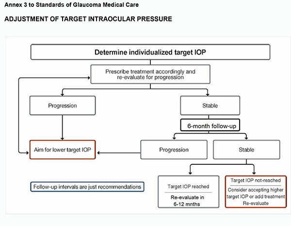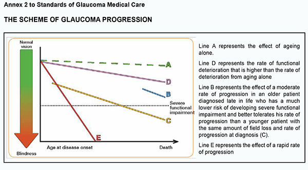 The rate of progression is an important factor that should be considered in determining the target IOP and intensity of treatment. Target IOP is the upper limit of the IOP estimated to be compatible with a rate of progression sufficiently slow to maintain vision-related quality of life in the expected lifetime of the patient. The treatment target is a compromise between reducing the risk of symptomatic vision loss and the side effects of therapy. Patient’s engagement in the treatment process, compliance and adherence to care is essential for effective IOP lowering and prevention of glaucoma progression. Compulsory criteria 3.1. Target IOP needs to be estimated separately for each eye of every patient. 3.1.1. In newly diagnosed patients, the target IOP is initially determined according to the stage of disease and the starting IOP, with the treatment goal being a specific IOP level or a percentage reduction. 3.1.2. Initial therapy may be with topical medication or selective laser trabeculoplasty in order to achieve a target IOP. 3.1.3. The target IOP is re-considered if a patient fails to attain a target IOP during follow-up or additional therapy is being administered, or the patient is being switched from one treatment to the other. If there are sufficient visual fields to judge the rate of progression, and this rate is sufficiently slow not to affect the patient’s quality of life, that the target IOP may be revised upward if the target IOP has not been met, or if the patient is on excessive therapy or is experiencing side effects (see Annex 3).