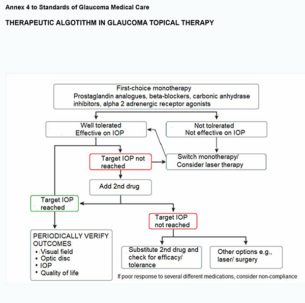 3.2. Most types of open angle glaucoma and many types of chronic close-angle glaucoma are initially treated with topical medications and occasionally oral osmotic. 3.2.1. Monotherapy is the first choice when initiating therapy. Prostaglandin analogues cause the greatest reduction in IOP and are considered most effective, followed by topical carbonic anhydrase inhibitors, non-selective beta-blockers, alpha adrenergic receptor agonists and selective beta-blockers. If the initial therapy reduces IOP to the target and is well tolerated, the therapy can be left unchanged, but the patient needs to be monitored with regular checking of endpoints (see Annex 4).