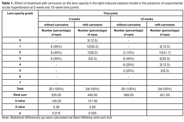 The long-term carnosine treatment course in a rabbit model of light-induced cataract in the presence of OHT had a stabilizing effect on the glutathione defense system in the lens. In experimental animals treated with carnosine, the reduced glutathione levels were significantly increased, whereas the oxidized glutathione levels were significantly decreased as compared to untreated experimental animals. Thus, at the 10-week time point, the reduced glutathione levels in the lenses of treated experimental animals averaged 75.3% (p < 0.05) of those in controls and 149.2 % (p1 <0.01) of those in untreated experimental animals. At the same time, the oxidized glutathione levels in the lenses of treated experimental animals averaged 126.5% (p < 0.05) of those in controls and 71.1 % (p1 <0.05) of those in untreated experimental animals. The changes in the reduction potential of the glutathione system similar to those in the lens tissue were noted in the aqueous humor of experimental animals. The reduced glutathione levels in the aqueous humor of untreated experimental animals showed a decrease over the study period, and, at the 10-week time point, averaged 56.2% (p < 0.001) of those in controls. At the same time, the oxidized glutathione levels in the aqueous humor were 52.5% higher in untreated experimental animals compared to controls (p <0.01). In the aqueous humor of treated experimental animals, the reduced glutathione levels at 5-week and 10-week time points were 15.4 % (1.37±0.07 ?M/l) and 21.0% (1.28±0.10 ?M/l), respectively, decreased compared to controls (1.62±0.09 ?M/l). At 5-week and 10-week time points, the oxidized glutathione levels in the aqueous humor of treated experimental animals were 7.5% (0.43±0.03 ?M/l) and 22.5% (0.49±0.10 ?M/l), respectively, increased compared to controls (0.40±0.09 ?M/l). In addition, at 5-week and 10-week time points, in treated experimental animals, the reduced glutathione levels were 20.2% and 40.7%, respectively, increased, whereas the oxidized glutathione levels were 20.4% and 19.7%, respectively, decreased, compared to untreated experimental animals. Therefore, we obtained experimental data on the beneficial effect of carnosine on the lens glutathione and thiol-disulphide systems damaged by light-induced cataract and under elevated IOP conditions, and these data help identify an important component in the mechanism of accelerated development of alteration in the optical properties of the lens. In our opinion, alterations in glutathione defense in the lens, if aggravated by ocular hypertension, are a key pathochemical mechanism of cataractogenesis. Effective contribution of carnosine to a significant improvement in the imbalance between oxidized and reduced glutathione in the lens, and to restoration of the thiol-disulfide system suggests feasibility of using this agent for prevention and treatment of cataract development. Conclusions First, a long-term intraocular treatment with carnosine in the rabbit cataract model improved the resistance of the lens to cataractogenic phototoxicity under ocular hypertension. By the 10-week time point, 8.3% of eyes in the treated experimental group had grade 5 lens opacity was versus 20.0% in the untreated experimental group. Second, introduction of carnosine in the rabbit model of light-induced cataract in the presence of OHP resulted in activation of the glutathione defense system in the lens, with 49.2% increase in the reduced glutathione levels and 28.3% decrease in oxidized glutathione levels in the lenses of treated experimental animals compared to untreated experimental animals. Finally, in the rabbit model of light-induced cataract in the presence of OHP, treatment with carnosine hampered activation of oxidative damage to proteins, with 40.7% increase in the sulfhydryl (thiol) levels and 28% decrease in the disulphide levels in the lenses of treated experimental animals compared to untreated experimental animals. References