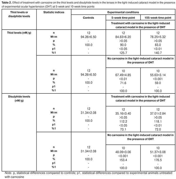Treatment with carnosine resulted in the reduction of light-induced cataractogenic effect in the presence of developing OHP. Thus, by the 10-week time point, the number of eyes with grade 5 lens opacity in the treated experimental group was 2.5 times lower than that in the untreated experimental group. No statistically significant abnormal lens changes were found in intact rabbits. Oxidative stress is a major mechanism involved in the development of senile cataract as well as primary glaucoma. Oxidation of protein molecules with cleavage of sulfhydryl bonds followed by formation of disulphide bonds instead of broken sulfhydryl bonds is one of the stages of oxidative stress. To assess the effect of carnosine on the level of oxidative stress in the anterior eye in light-induced cataract in the presence of OHT, first of all, the thiol-disulphide system in the lens was investigated. With this in mind, the sulfhydryl (thiol) and disulphide levels in lenses of experimental animals were determined. In addition, the effect of carnosine on reduced and oxidized glutathione levels in the lens was investiaged. Table 2 presents the data on the thiol and disulphide levels in lenses of experimental animals affected by light and OHP.