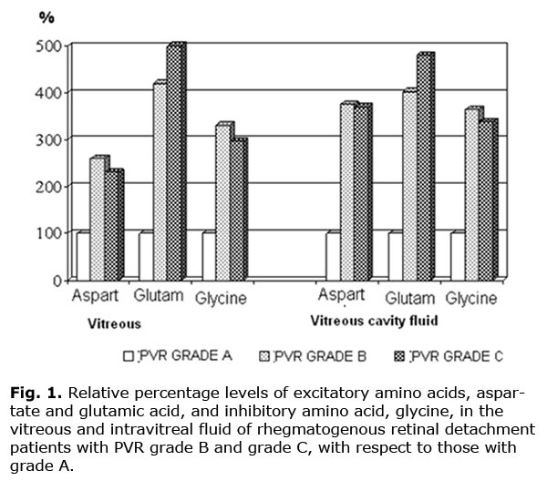 Additionally, the data obtained provide evidence that further progression of the proliferative process is accompanied by the increase in the levels of both excitatory and inhibitory amino acids, with the changes of the latter being less apparent. This was confirmed by the corresponding values of the coefficient estimated as the ratio between the sum of the excitatory amino acid indices and that of the inhibitory acid indices: these values for the vitreous samples in PVR grade A, grade B and grade C were 5.67, 6.03 and 7.51, respectively, versus 3.99, 4.70 and 4.55 for the samples of intravitreal fluid. Conclusion The development of proliferative vitreoretinopathy in RRD patients is accompanied by an increase in the levels of neurotransmitters, aspartate, glutamic acid, and glycine, both in the vitreous and intravitreal fluid. If the PVR continues to progress, with the development of fixed retinal folds, and if the detachment duration is significant, a tendency to decrease in the neurotransmitter levels is observed. In RRD patients with progressive PVR, an imbalance between the levels of excitatory and inhibitory neurotransmitters (aspartate and glutamic acid vs. glycine) is observed, resulting in the excitotoxic effect, and creating pathochemical preconditions for retinal degeneration.