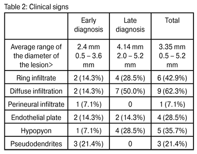 ![]() Diffuse infiltration was the most frequent symptom (62.3%). Ring infiltration, albeit partial in some cases, was found in six eyes (42.9%). Hypopyon was observed in five cases (35.7%). Pseudodendritic keratitis, which is often confused with herpetic keratitis, was seen in three eyes (21.4%). Finally, perineural infiltrate, sometimes considered the result of pathognomic amoeba infection (17), was only observed in one case (7.1%).