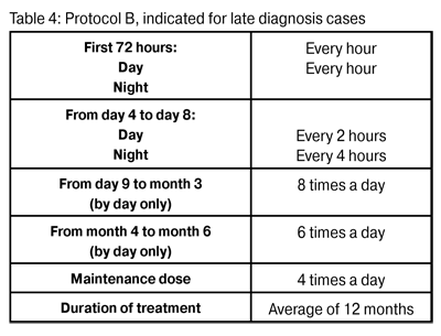 An evaluation was also made of the duration of treatment necessary for achieving elimination of the microorganism. In cases where treatment was initiated early, the median was six months, and when treatment began late the median was ten months (p=0.0045) (Table 6).
