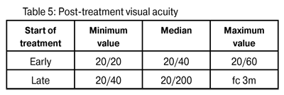 In cases where associated bacterial infections were found, 0.3% gatifloxacin eye drops were used. In all the eyes 1% topical atropine was employed. In none were topical corticosteroids indicated. In the majority of patients a conditional oral analgesic was recommended. In early diagnosis cases pre-treatment visual acuity fluctuated between 20/40 and 20/100; in late diagnosis cases between 20/60 and a 1 m finger count (fc). The median post-treatment visual acuity of the first group was 20/40 and in the second 20/200 (p = 0.0125) (Table 5.).