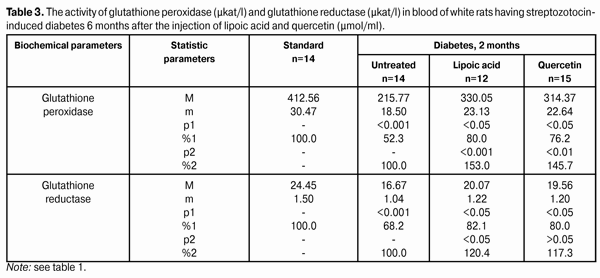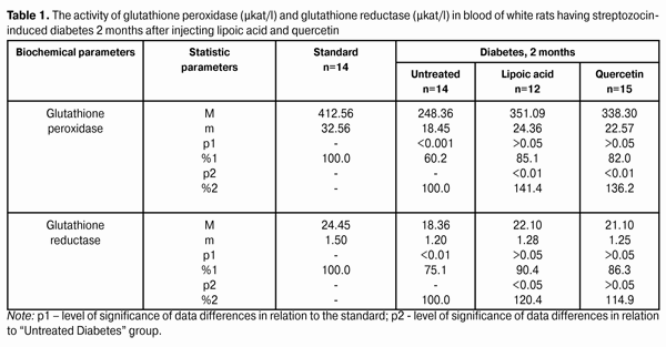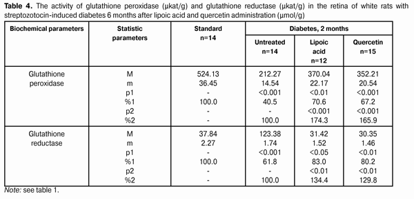 Introduction Diabetes mellitus (DM) occupies the third place among the direct death reasons in the world after cardiovascular and oncological diseases and it is the leader of complications occurrence causing the early disability of patients [2, 5, 6, 15]. Depending on the type and duration of diabetes mellitus course, the diabetic retinopathy progresses in practically all the patients; this is one of the main reasons of visual disability in able-bodied persons in economically developed countries. It requires the development of effective methods of diabetic retinopathy treatment that is possible only on the basis of in-depth study of nosotropic mechanisms of this disease [1, 3, 8, 11, 12, 21, 23, 25]. Some studies have demonstrated a satisfactory evidence of the role of free-radical processes and, particularly, lipid peroxidation (LPO) in the mechanism of diabetic damages of vases and other tissue structures [13, 14]. During DM, the LPO intensification occurs in the retina and pigmental epithelium by forming a redundant quantity of free radicals that causes a destabilization and a subsequent breakdown of cell elements. In this case, the highest LPO intensity is observed in the receptor retina layer. Afterwards, the soluble LPO products diffuse into inner retina layers and are found in the inner sympatic layer and ganglion cells layer [4, 17]. A high level of lipid peroxide is also determined in the blood plasma. In erythrocytes, the level of intermediate LPO product – malondialdehyde rises and progressively grows while the ocular fundus changes are increasing. The high activity of oxidative reactions during the DM directly correlates with the intensity of vascular complications. The progress of these reactions causes the death of endotheliocytes, lipids oxidation and their modification as well as the transition of platelets into the reactivity state [18, 20]. Therefore, it is required to find out a recovery mechanism of LPO processes with the help of glutathione system. In the meantime, it is demonstrated that during the streptozotocin-induced diabetes there was a sudden reduction of glutathione contents in the eye retina of experimental animals, mainly, by reducing the concentration of its recovered form. The stimulation of glutathione peroxidase reaction, neutralizing lipids hydroperoxides, which level during diabetes, as known, considerably rises, plays an important role in the mechanism of change of oxidized and reduced glutathione form ratio. It should also be considered that the reduced glutathione form can directly quench free-radical compounds, besides, a drop of general level of reduced glutathione can occur by forming a glutathione conjugate with hydroxyl aldehydes and other toxic compounds which in such a conjugated form are excreted from the organism [19, 22, 24]. According to the data of experimental studies, when the experimental diabetes progress, the activity of enzymes of the antioxidant system (superoxide dismutase, catalase and glutathione peroxidase) is progressively reduced. The application of В6 vitamin preparations in the initial period of experimental diabetes (2 months) considerably allows preventing the inhibition of antioxidant system enzymes. It has been noted that В6 vitamin had the most expressed effect on enzymes - glutathione peroxidase and superoxide dismutase [10]. It has been also determined that the application of complex of functionally conjugate co-enzymes considerably activates the enzymes of the antioxidant system (superoxide dismutase, catalase and glutathione peroxidase) in the retina of white rats in 28 days after the streptozotocin-induced diabetes development [9]. The more expressed stimulation with respect to glutathione peroxidase is caused by “Milgamma” and “Fakovit” preparations. Under the effect of these preparations, an activity rise of this enzyme is registered in the retina of animals during experimental diabetes (28 days) [9]. So the necessity of studying the state of enzymatic antioxidant system as well as of searching its stimulation methods during the treatment of diabetic retinopathy is obvious. Work objective: to study quercetin and lipoate effect on antioxidant system enzymes, in particular, on glutathione peroxidase and glutathione reductase during the experimental diabetes. Material and methods The investigations were carried on albino Wistar rats weighing 180 – 210 g. Experimental animals were divided into four groups: first – control group (14 rats), second – experimental group (14 rats), animals with developing diabetes, without drug administration, third – experimental group (12 rats), animals with developing diabetes and lipoic acid administration, fourth – experimental group (15 rats), animals with developing diabetes and quercetin administration. Quercetin and lipoic acid were administered to the animals with developing diabetes orally during the whole experimental period (6 months). During the performance of the experiment, the recommendations accepted by international community for visual organ study with regard to the investigations of animals were followed. The diabetes was induced by means of streptozotocin injection (55 mg per 1 kg of body weight, i.p.). Two months after the diabetes progress, some animals (separate groups), being in different experiment conditions as well as normal rats (control) were decapitated with thiopental sodium preanesthetic (50 preparation mg per weight kg). The eyes were enucleated on ice at a temperature of 0 – 5°С. Six months after the diabetes progress, the rest of animals, still being in different experiment conditions, were also pithed according to the appropriate rules. The deleted retina of animals came to study at once. The activity of glutathione peroxidase and glutathione reductase was determined in the retina homogenates and blood plasma. The activity of glutathione peroxidase was determined spectrophotometrically following the rate of oxidized glutat
