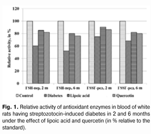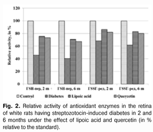 When quercetin was applied, the activity of glutathione peroxidase rose by 65.9% in relation to the group of untreated animals being equal to (352.21±20.54) ?kat/g (р<0.001). Meanwhile the enzyme activity in untreated animals with diabetes was reduced to 40.5% as compared with the standard (524.13±36.45) ?kat/g (р<0.001). The activity parameter of glutathione reductase in the retina during the diabetes progress and lipoic acid application rose to (31.42±1.52) ?kat/g, i.e. was equal to 134.4% in relation to the group of diabetic untreated animals (23.38±1.74) ?kat/g (р<0.01), and, when applying quercetin, it rose by 29.8% being equal to (30.35±1.46) ?kat/g, as compared with the “Diabetes” group (р<0.01). The enzyme activity with untreated diabetes was reduced to 61.8% as compared with the standard (37.84±2.27) ?kat/g. Generalizing the study results of the antioxidant system state in the retina and blood plasma during the experimental diabetes, it is possible to specify the following. The activity of glutathione peroxidase in blood plasma in the group of untreated animals with diabetes (2 months) was reduced to 39.8%, and in 6 months – by 47.7% in relation to the standard. The activity of glutathione reductase in blood plasma in 2 months was reduced by 24.9%, and in 6 months – by 31.8%. Under the lipoic acid effect, the activity of glutathione peroxidase in blood plasma after two-month diabetes progress rose by 41.1%, and after then – by 53.0% as compared with the untreated animals. Meanwhile the activity of glutathione reductase in blood plasma in 2 and 6 months rose by 20.4% in relation to the untreated animals. After two months of observation, under the quercetin effect, the activity of glutathione peroxidase in blood plasma rose by 36.2%, and after six months – by 45.7%, and the one of glutathione reductase – by 14.9 and 17.3% correspondingly. The activity of glutathione peroxidase in the retina of animals with untreated diabetes (2 months) was reduced by 54.3%, and in 6 months – by 59.5% in relation to the standard while the activity of glutathione reductase was reduced correspondingly by 31.8% and by 38.2% as compared with the standard. Under the lipoic acid effect, the activity of glutathione peroxidase in the retina of white rats after two-month of diabetes progress rose by 65.0%, and after 6 months – by 74.3% as compared with the untreated animals, thereby the activity of glutathione reductase in the retina of animals in 2 months rose by 26.7%, and in 6 months by 34.4% in relation to the group of untreated animals. After the application of quercetin, the activity of glutathione peroxidase in the retina in 2 months rose by 60.6%, and after six months – by 65.9%, the one of glutathione reductase – by 20.4 and 29.8% correspondingly. Our findings show that the application of thiol preparation and bioflavanoid considerably contributes to the stabilization of hydroperoxide dewatering processes in the retina in the conditions of experimental diabetes, while the effect of thiol preparation – lipoic acid occurred to be more expressed as compared with quercetin. Conclusions 1. The application of lipoic acid and quercetin preparations during experimental diabetes (2 and 6 months) considerably allows preventing the inhibition of antioxidant system enzymes in the retina of animals. It is confirmed by the rise in glutathione peroxidase activity in the retina by 65.0% (in 2 months) and by 74.3% (in 6 months) when lipoate is applied, and the rise of glutathione reductase activity by 26.7% (in 2 months) and by 34.4% (in 6 months) in relation to the group of untreated animals. The quercetin application (in 2 months) increases the activity of glutathione peroxidase by 60.6% and after six months – by 65.9%, and the activity of glutathione reductase – by 20.4 and 29.8% correspondingly. 2. Lipoic acid is characterized by the most expressed effect related to the damage degree reduction of the enzymes of the antioxidant system. References 1. Gogina IF, Andriu LV, Ogranovich OE. [Diabetic angio-, retino-, neuropathy: patogenesis, clinic, treatment], Lviv: Liga press; 2000. 186 p. In Ukrainian. 2. Evgrafov VYu. [Diabetic retinopathy: patogenesis, diagnosis, treatment: syn. of thes. ... of M.D.]. М. 1996; 47 p. In Russian. 3. Efimov А, Skorobonskaya N, Zueva N. [Diabetic neuropathy]. Liky Ukrainy; 2005; 3: 21-25. In Russian. 4. Kravchuk EA. [The role of free radical oxidation in pathogenesis of eye diseases]. Vestnik oftalmologii. 2004; 5: 48-51. In Russian. 5. Kryzhanovskaya TV. [Nosotropic rehabilitation aspects of diabetic retinopathy patients]. Mater. of 2-nd Inter. Conf. “Modern Aspects of Cardioendocrinopathy of Ocular Organ”. K. 2005: 73-74. In Russian. 6. Leus NF. [Metabolic development mechanisms and pharmacotherapy aspects of diabetic retinopathy]. Oftalmol Zh. 2003; 5: 75-80. Russian. 7. Nasledov A. [SPSS computer data analysis in psychology and social sciences]. Spb.: Peter; 2005. 416 p. In Russian. 8. Nedzvetskaya OV. [Modern trends in diabetic retinopathy treatment]. Intern. Med. J., 2000; 3: 56-58. In Russian. 9. Olejnik ТV. [The effect of vitamin-coenzyme complexes on antioxidant enzymes retina system during experimental diabetes]. Oftalmol Zh.. 2007; 6.: 58-61. In Russian. 10. Pavlyuchenko KP, Mogilevsky SYu, Chujko AL. [The state of antioxidant enzymes system in the retina during experimental diabetes and application of vatamin В6]. J. Oftalmol Zh. 2011; 3: 73-78. In Russian. 11. Pasechnikova NV, Naumenko VA, Zborovskaya AV. [Blood-retinal barrier state during diabetic retinopathy as per fluorometry data]. Oftalmol Zh. 2008; 5: 4-7. In Russian. 12. Pasechnikova NV. [Laser treatment during ocular fundus pathology]. Pasechnikova NV. Kyiv: Research and production association “Naukova dumka” publishing house of NAS of Ukraine”; 2007. 201 p. In Russian. 13. Sidorova MV. [Diabetic retinopathy. Pathogenesis, clinic, treatment]. K.: SMP “AVERS