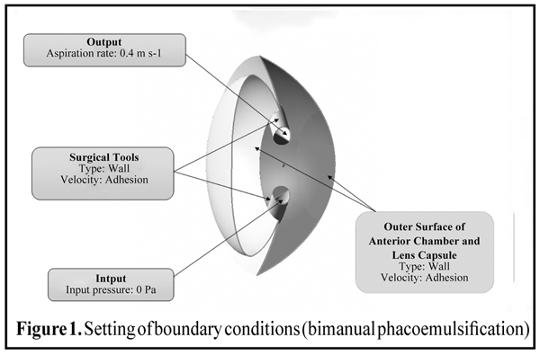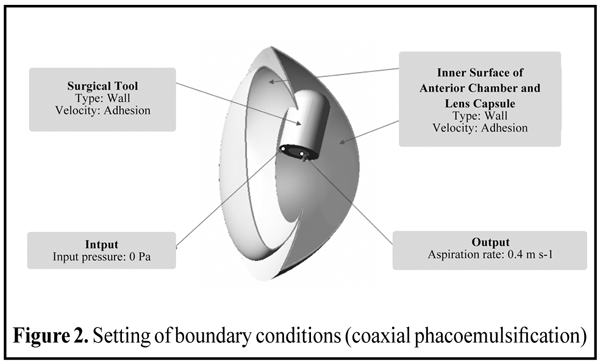 Irrigation and aspiration surgical instruments were used in the method of bimanual phacoemulsification. Setting of boundary conditions is shown in Figure 1. A type of boundary "wall" with a boundary condition for velocity named "adhesion" (i.e. it's equal to zero) is set on the surface of the first camera, crystalline lens, surgical instruments. Differential pressure 0 Pa (calculated based on the absolute pressure equal to 101000 Pa) is set on the end surface of irrigation device. Pumping rate 0.4 m/s is set on the end surface of aspirating device.