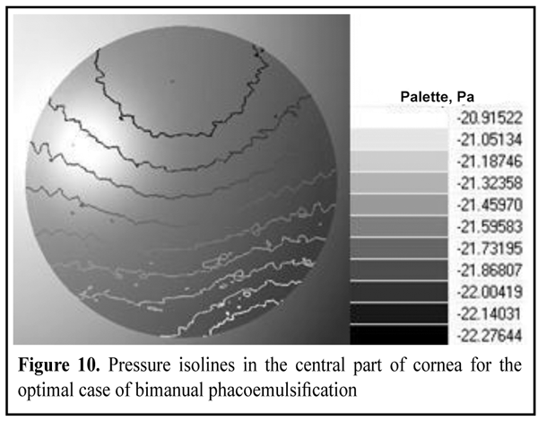 When position of surgical instruments had been optimized and the best positions had been identified on the criterion of minimizing the friction forces in the central part of the cornea, it was appropriate to compare methods of bimanual and coaxial phacoemulsification. The comparison was conducted according to three criteria: integral velocity in the central part of the cornea <V> (measure of the friction force), integral pressure on the cornea <?P> calculated relative to the pressure set at the position of the opening of the irrigation tool (measure of differential pressure in eye) and eye wash duration ? as well. The results are shown in the table 1.