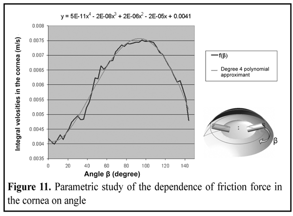 The parametric study of the dependence of an average velocity of fluid flows in the central part of  the cornea on the angle (the irrigation device was fully set in the optimal position) was pursued. A specific dependence was determined. It was approximated by a polynomial of the 4th degree and the corresponding formula was received (Fig. 11).