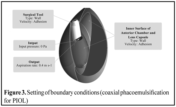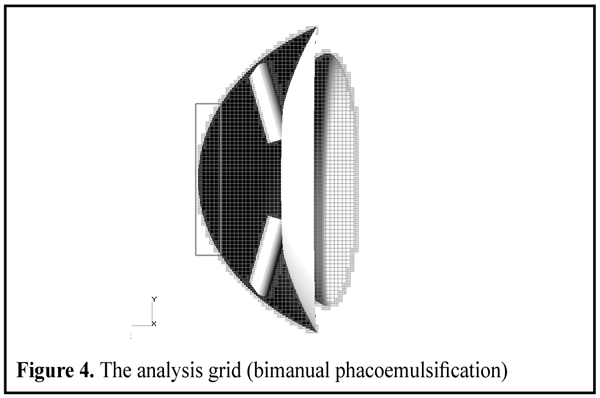 In coaxial phacoemulsification method for PIOL, the operation of eye washing by coaxial phacoemulsification method in the eye with previous implanted artificial lenses (PIOL) is considered. Setting boundary conditions does not differ from the previous cases (Fig 3).