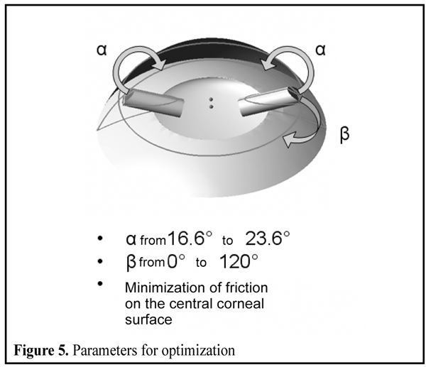Bimanual  phacoemulsification  method. The simulation of flow was carried with varying of different parameters of the configuration of devices: angles perpendicular to the plane of iris; angles parallel to the plane of iris and depth of instruments penetration. Nine various situations were discussed, out of which the best and the worst positions were identified. The pressure in the central part of the cornea (against the intake pressure of fluid in irrigation device) and average velocity of the flow in the central part of the cornea (friction force in the cornea) were used as criteria for selection. The best result was obtained when the devices were symmetrically positioned and directed in the center of the lens. The worst results were obtained when the instruments were positioned at a shallow angle to each other and had various depth of penetration. Two parameters were selected for further optimization. The first parameter is an angle in the plane perpendicular to the iris plane. Both instruments will symmetrically move along it within the appropriate range. The second parameter is an angle in the plane parallel to the iris plane. It will be established at the irrigation device and vary within the preset range at the aspirator (Fig. 5).