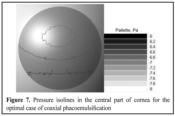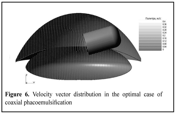 Coaxial phacoemulsification method. The simulation of flow was carried with varying of the depth of coaxial device penetration. Five various positions of the instrument were considered. The average pressure of fluid flows in the central part of cornea and the pressure in the central part of the cornea (against the intake pressure of fluid in irrigation device) were monitored. It was found that while decreasing the depth of instrument penetration, friction forces on the cornea linearly grew on the fluid side, and differential pressure sharply increased with minimal penetration depth. Velocity vector distribution in the best variant is shown in Fig. 6. Pressure isolines in the central part of cornea are presented in Fig. 7.