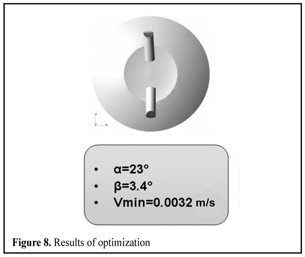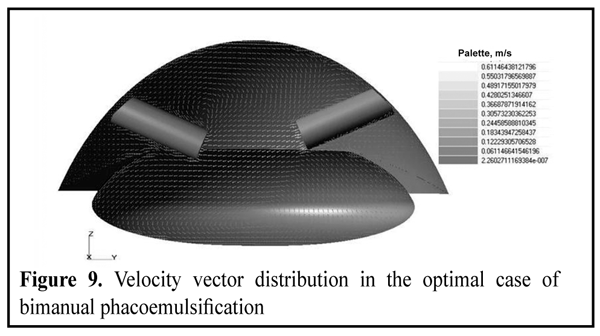 Optimization of positions of the devices in bimanual phacoemulsification. Optimization of positions of the devices in bimanual phacoemulsification were carried with IOSO NM [13] program complex according to the selected parameters and. 100 various variants were addressed and the best one from the point of the minimal average velocity of fluid flows in the central part of cornea (minimal friction force) was identified. The minimal velocity was 0.0032 m/s with the following angles: ?=23°,  ?=3.4° (Fig. 8). Velocity vector distribution in the anterior chamber of the eye and pressure isolines in the central part of cornea are presented in Fig. 9 and Fig. 10, accordingly.