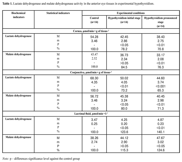 Conclusions 1. In experimental hypothyroidism, the activity of LDH and MDH was reduced in the cornea by 29.2% and 23.7%, and by 34.7% and 28.7% in the conjunctiva, respectively. 2. A significant increase in the activity of redox enzymes in the lacrimal fluid was revealed in the course of the pronounced hypothyroidism stage (LDH – by 36.3%, MDH – by 24.6%). Wherein, the degree of change of lactate dehydrogenase activity was determined by the hypothyroidism stage.
