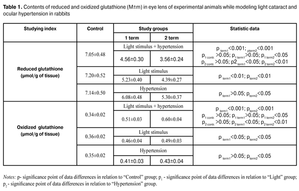 Methods. Experimental studies were carried out on 39 rabbits, which were divided into three groups: in first group (9 animals) the light cataract was modeled, in the second group (8 animals) ocular hypertension was modeled, and in third one (10 animals) the ocular hypertension was induced after light illumination. Control group comprised 12 animals. In eye lenses and chamber liquid of experimental animals, the levels of reduced and oxidized  glutathione were detected.