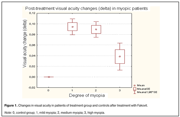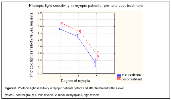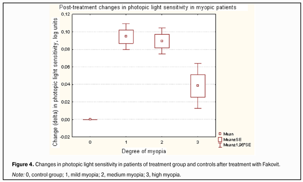 It is seen that after treatment with Fakovit, the photopic light sensitivity improved most of all in mild myopes (0.16±0.04 log units) followed by medium myopes (0.13 ± 0.06 log units) and high myopes (0.13 ± 0.08 log units) of the treatment group, but not significantly. However, the photopic light sensitivity in all patients of the treatment group increased significantly compared to controls (р < 0.05; Fig. 4).
